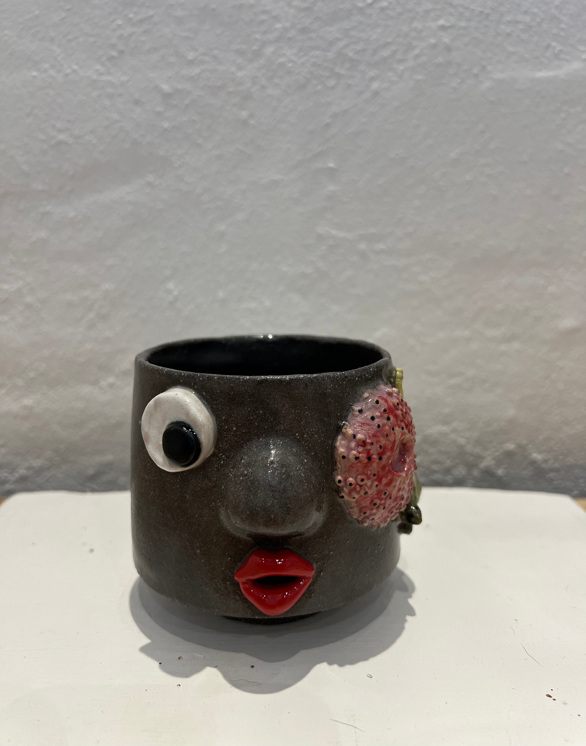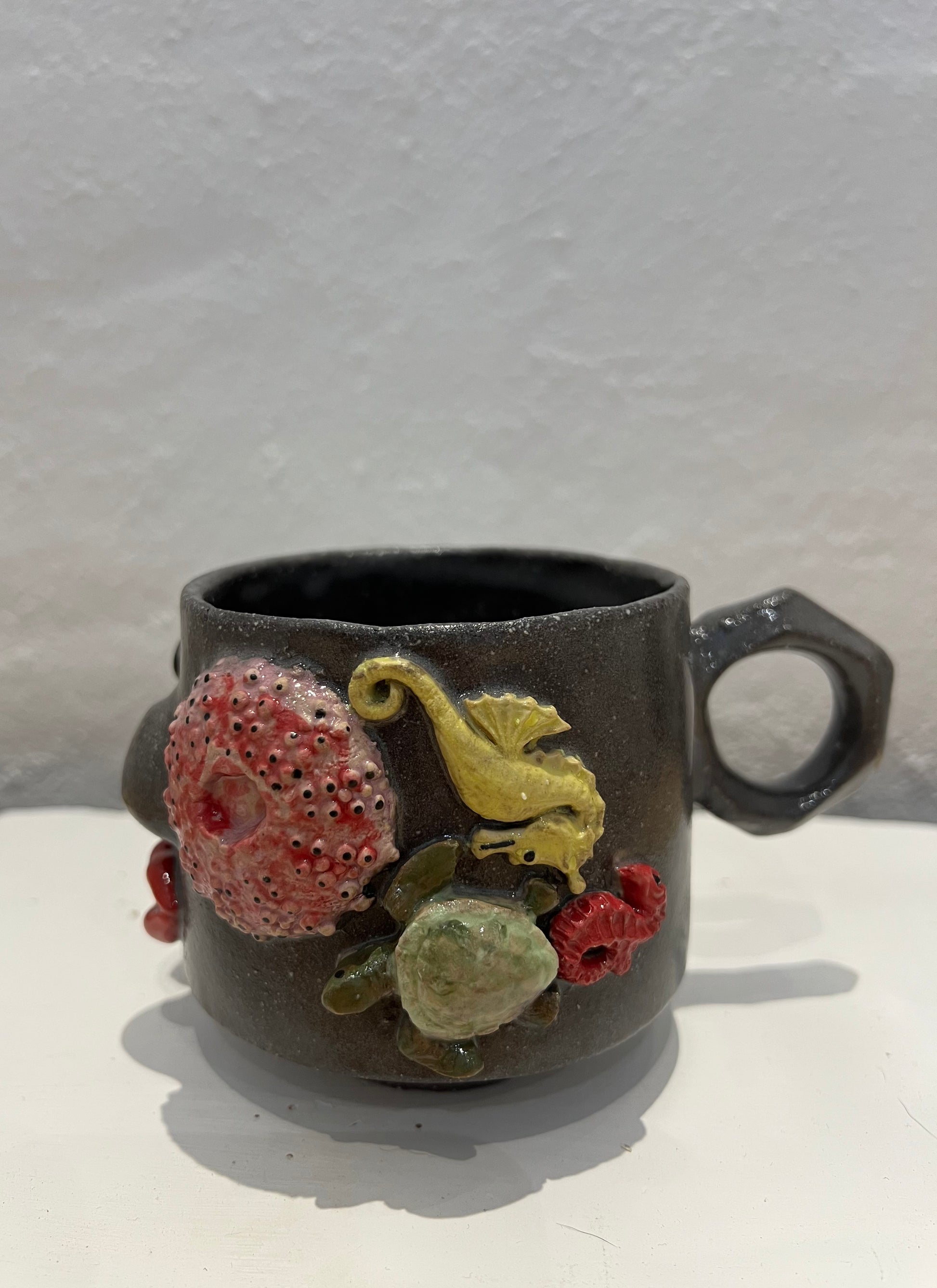 Unik håndlavet kop i mørkt stentøj. Forsiden har et sjovt ansigt, og bagsiden er dekoreret med små havdyr og koraller. Velegnet til både kaffe og te.