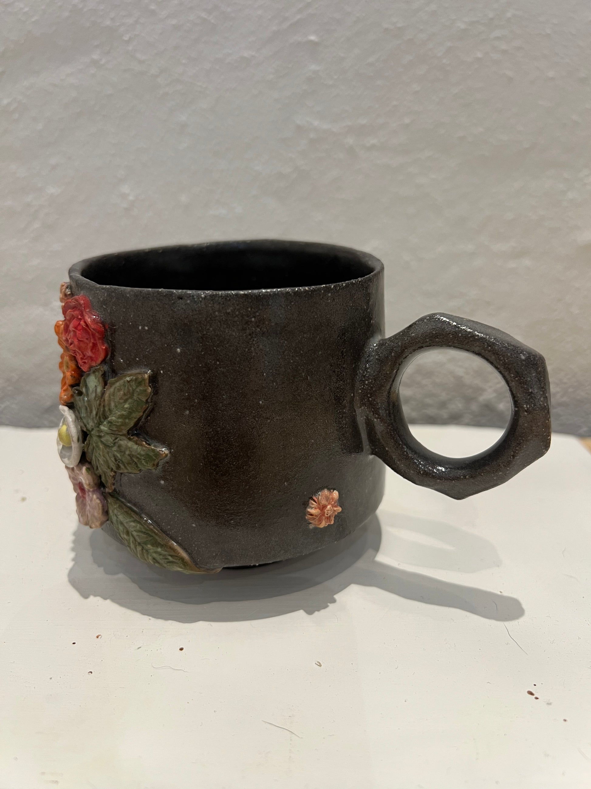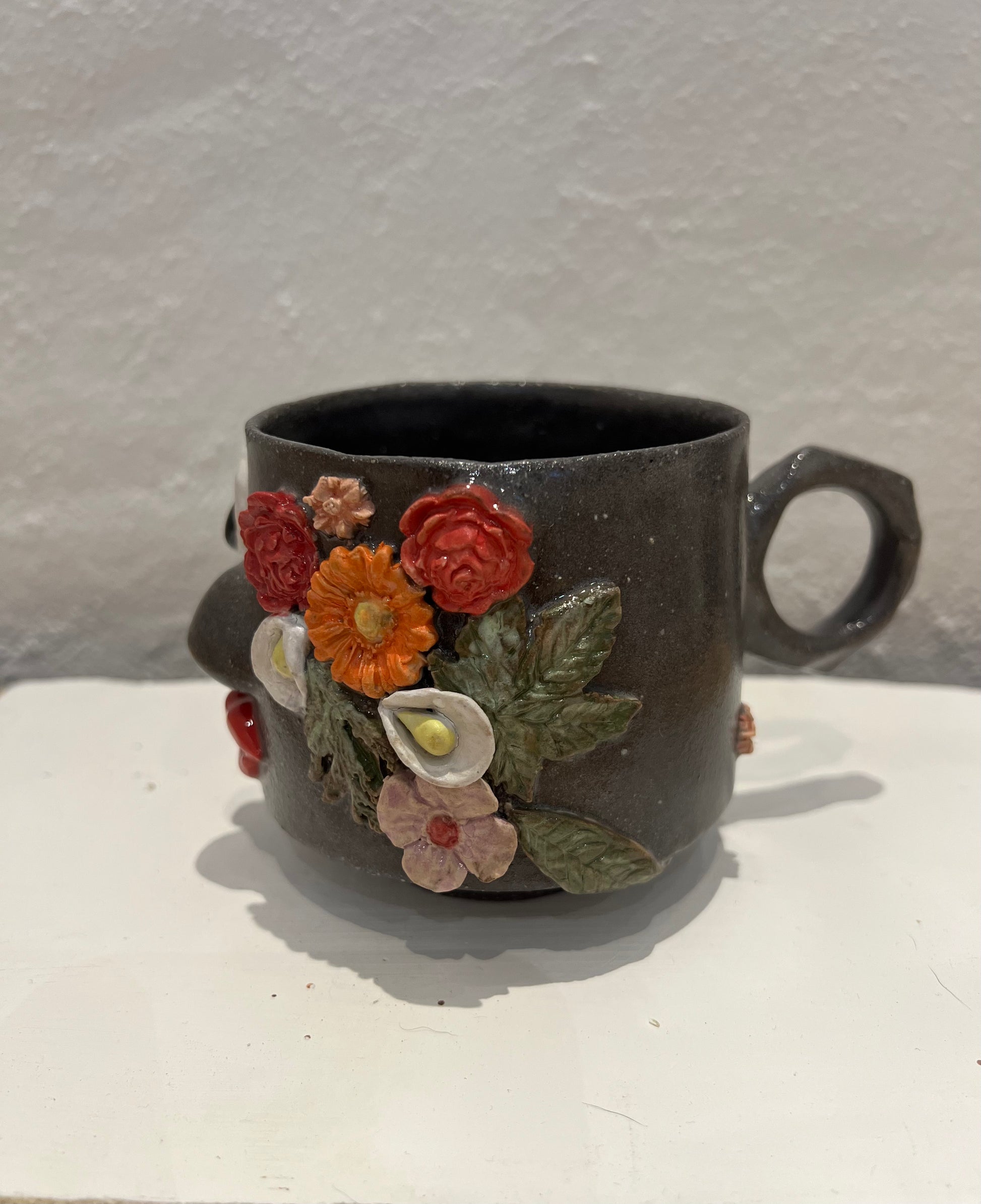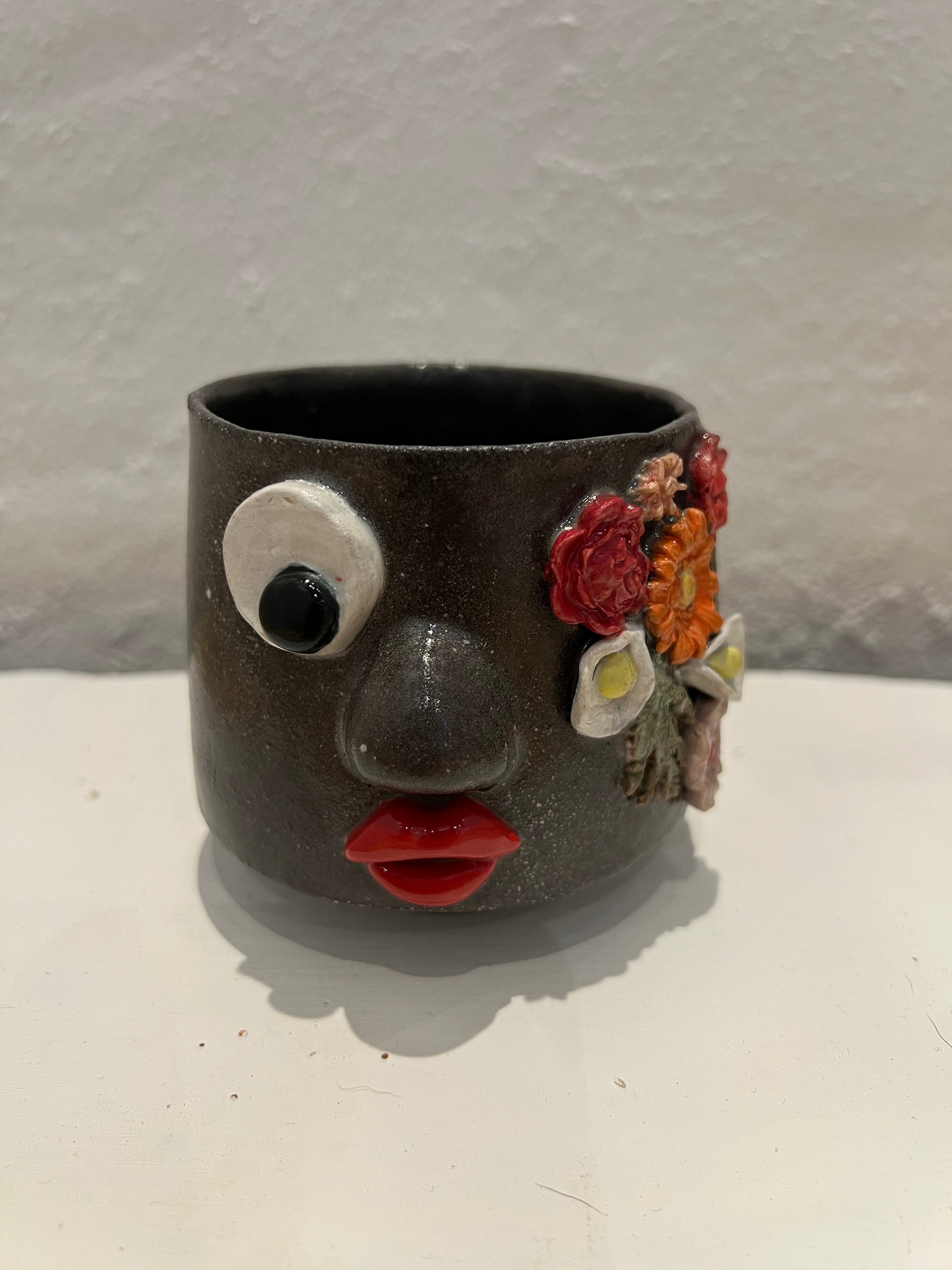 Unik håndlavet kop i mørkt stentøj. Forsiden har et sjovt ansigt, og siden er dekoreret med farverige blomster. Velegnet til både kaffe og te.