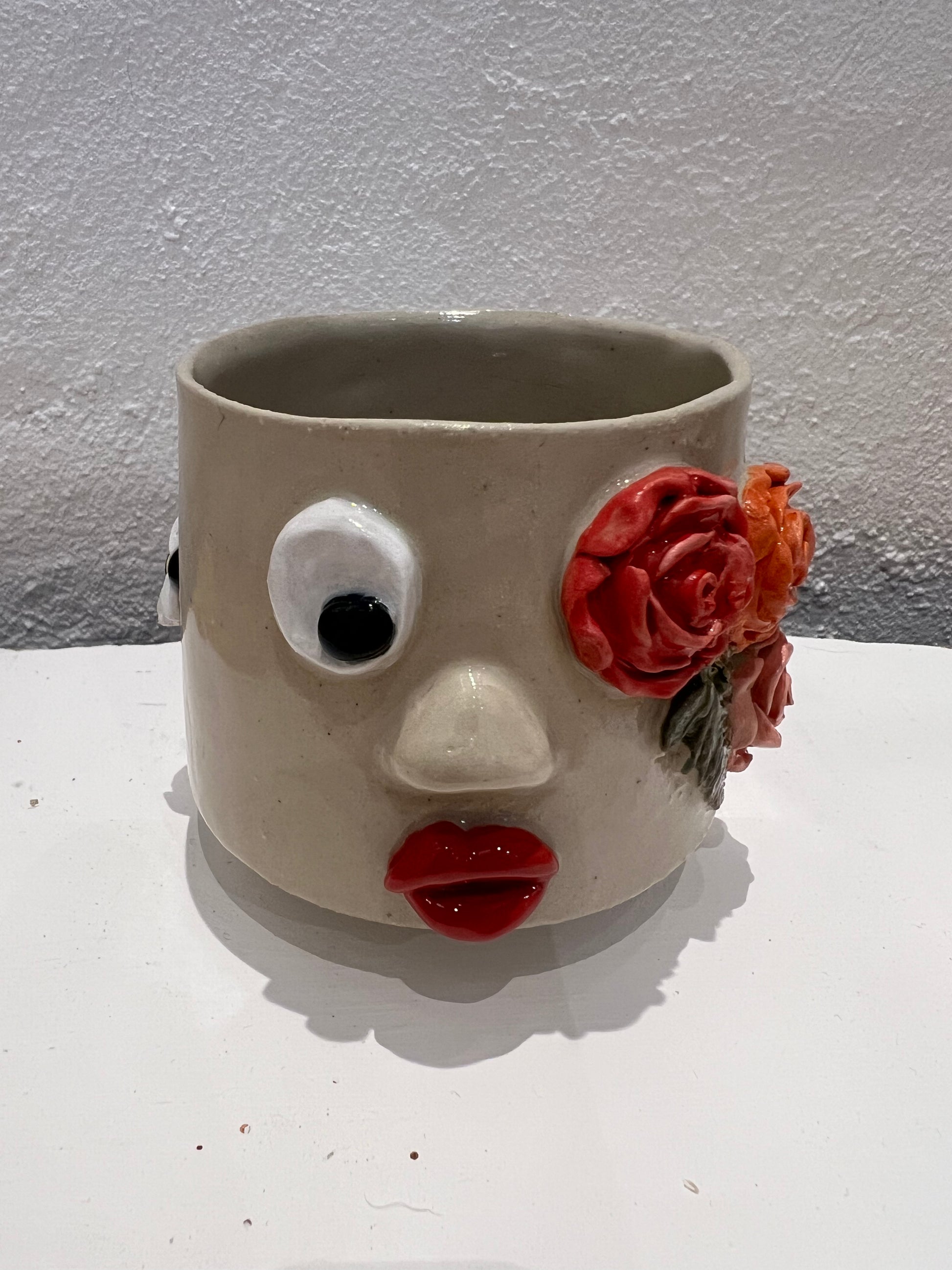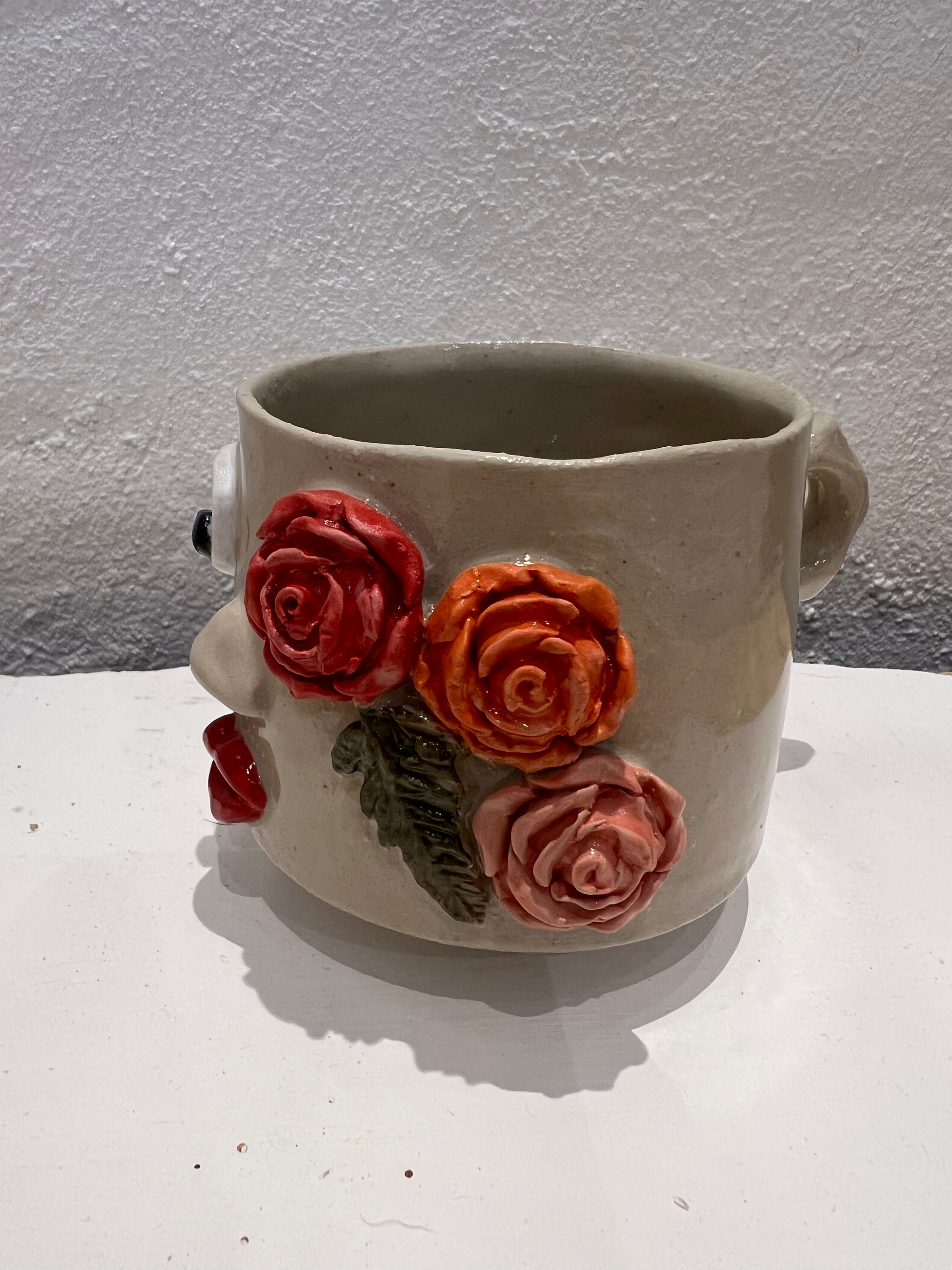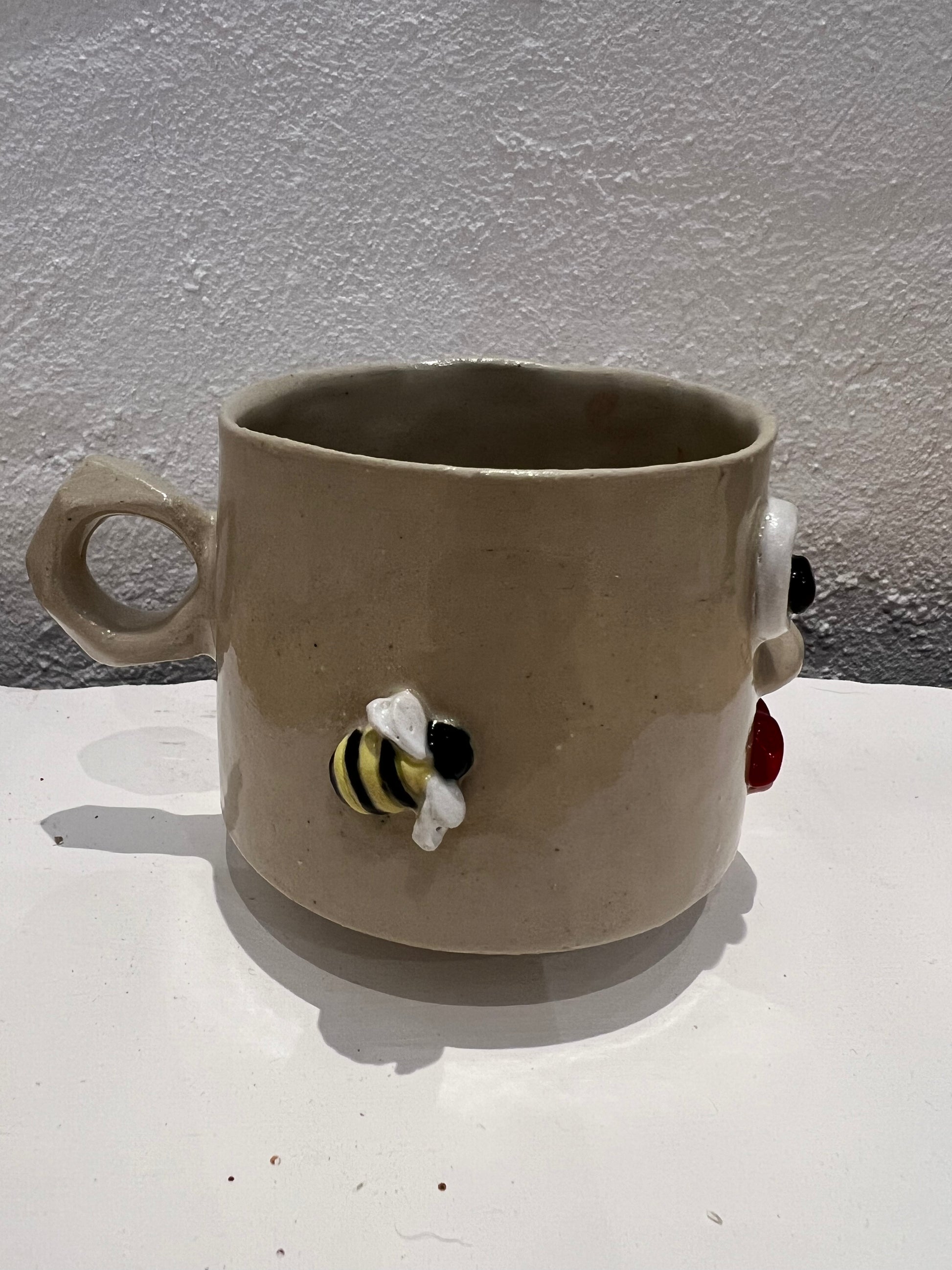 Håndlavet kop i lyst stentøj med sjovt ansigt foran, farverige blomster på siden og en lille bi på bagsiden. Velegnet til både kaffe og te.