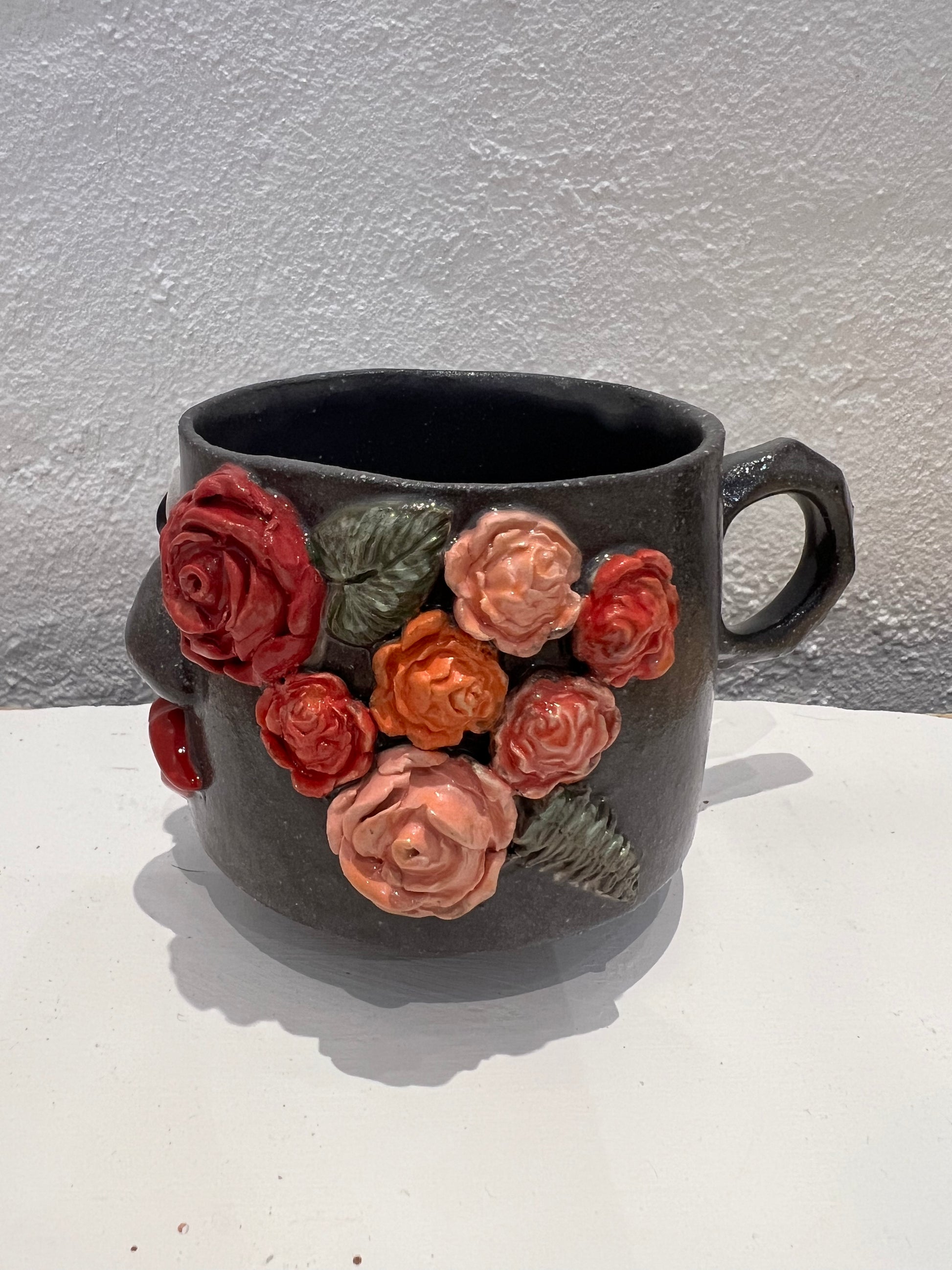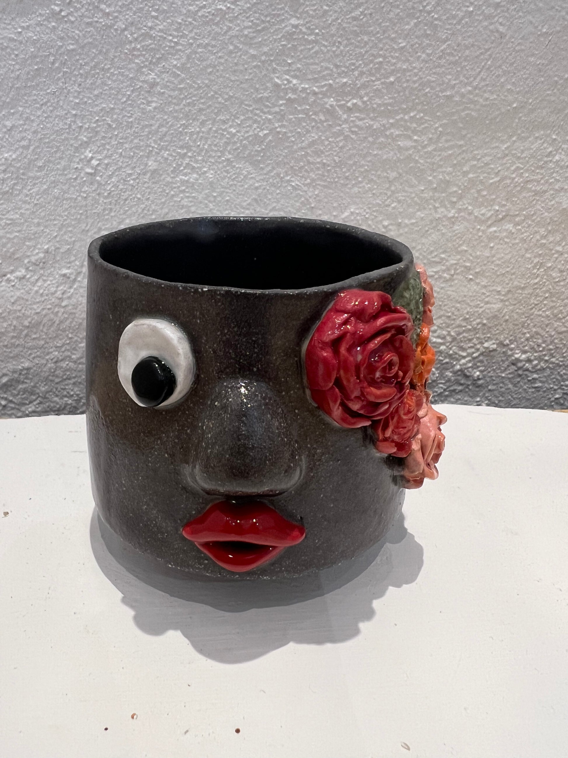 Unik håndlavet kop i mørkt stentøj med sjovt ansigt foran og smukke roser på siden. Perfekt til både kaffe og te.