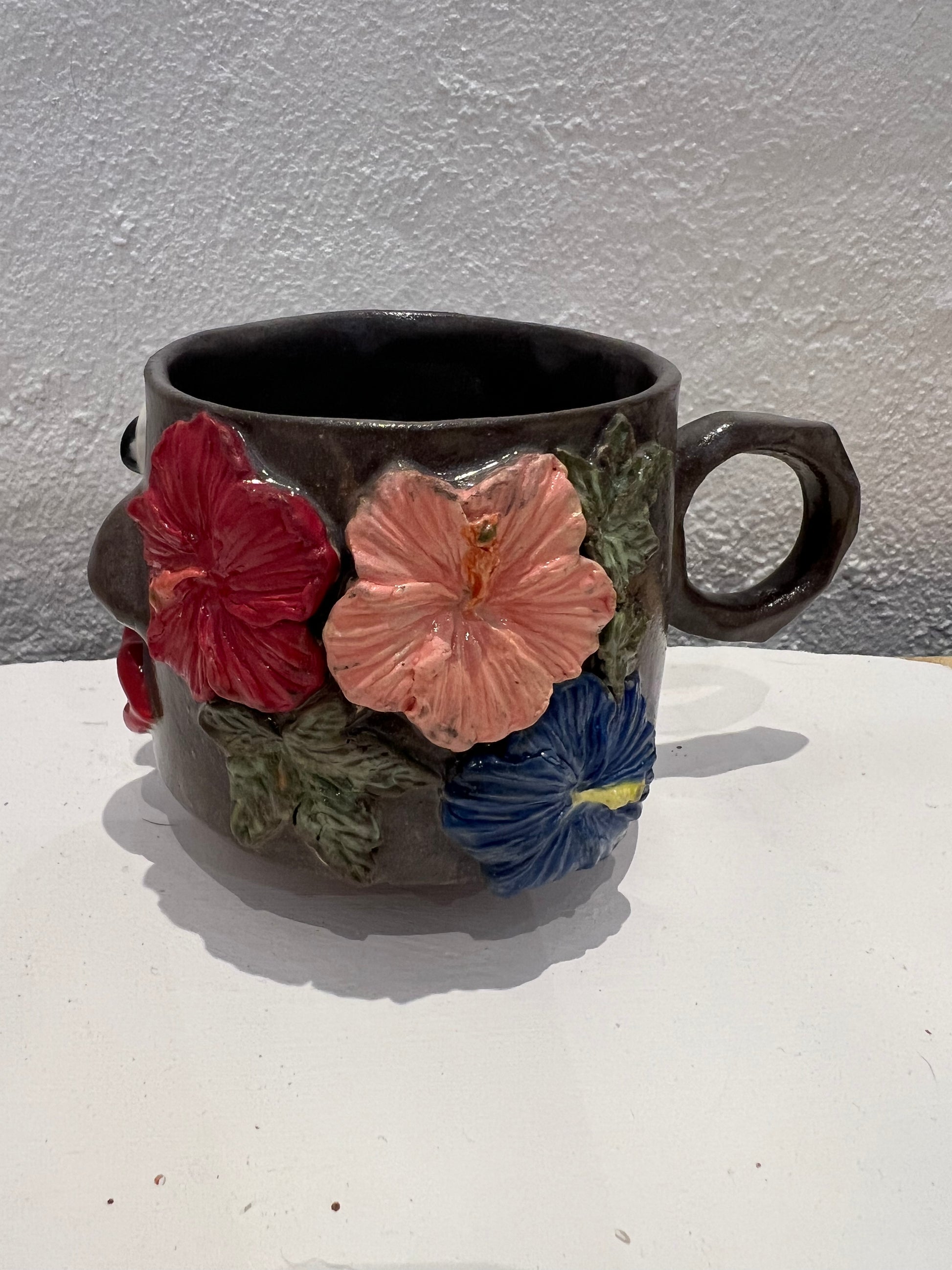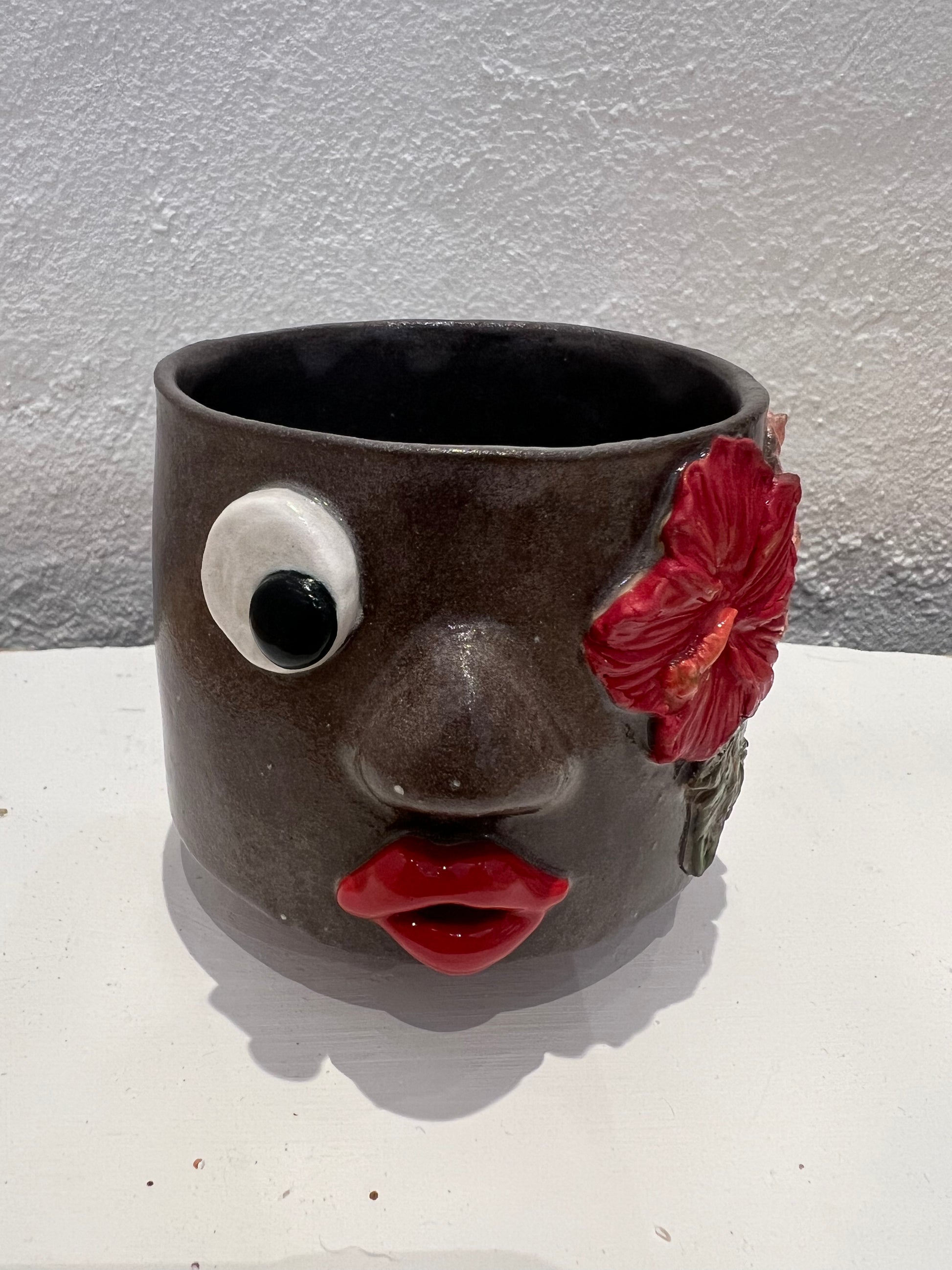 Håndlavet kop i mørkt stentøj med sjovt ansigt foran og en buket farverige blomster på siden. Velegnet til både kaffe og te