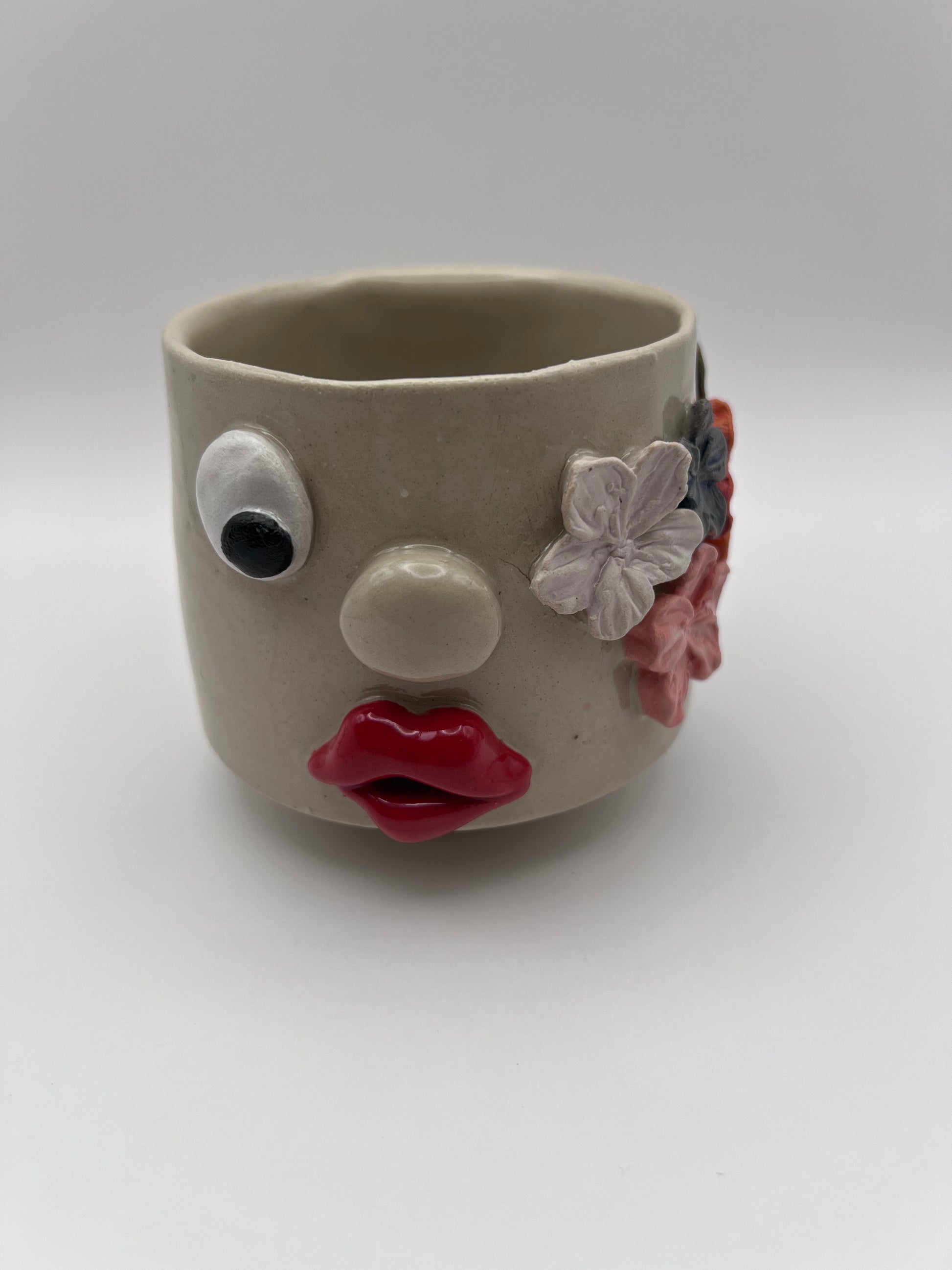Håndlavet kop med modelleret ansigt og blomsterdetaljer. En karakterfuld kop til kaffe eller te.