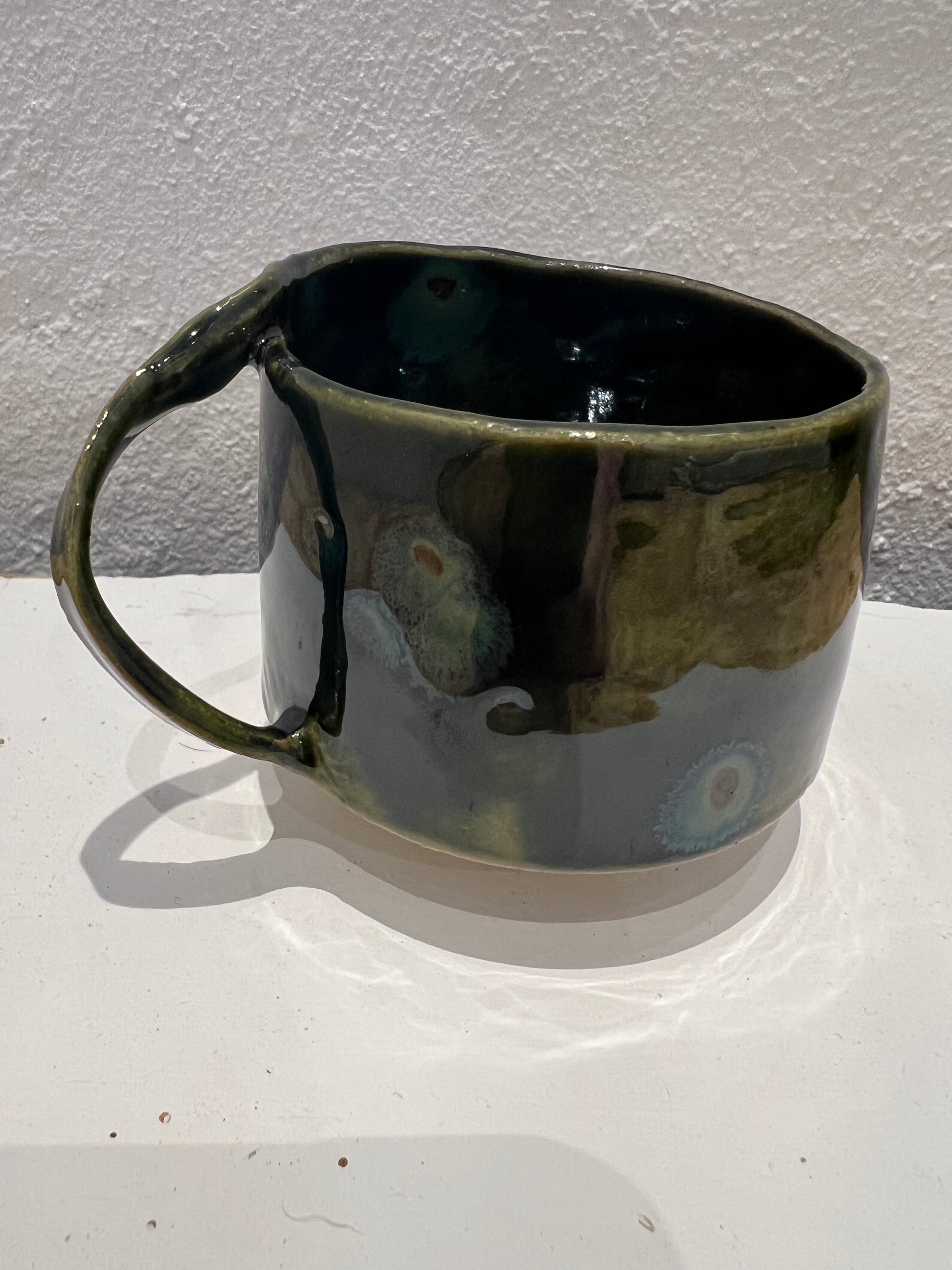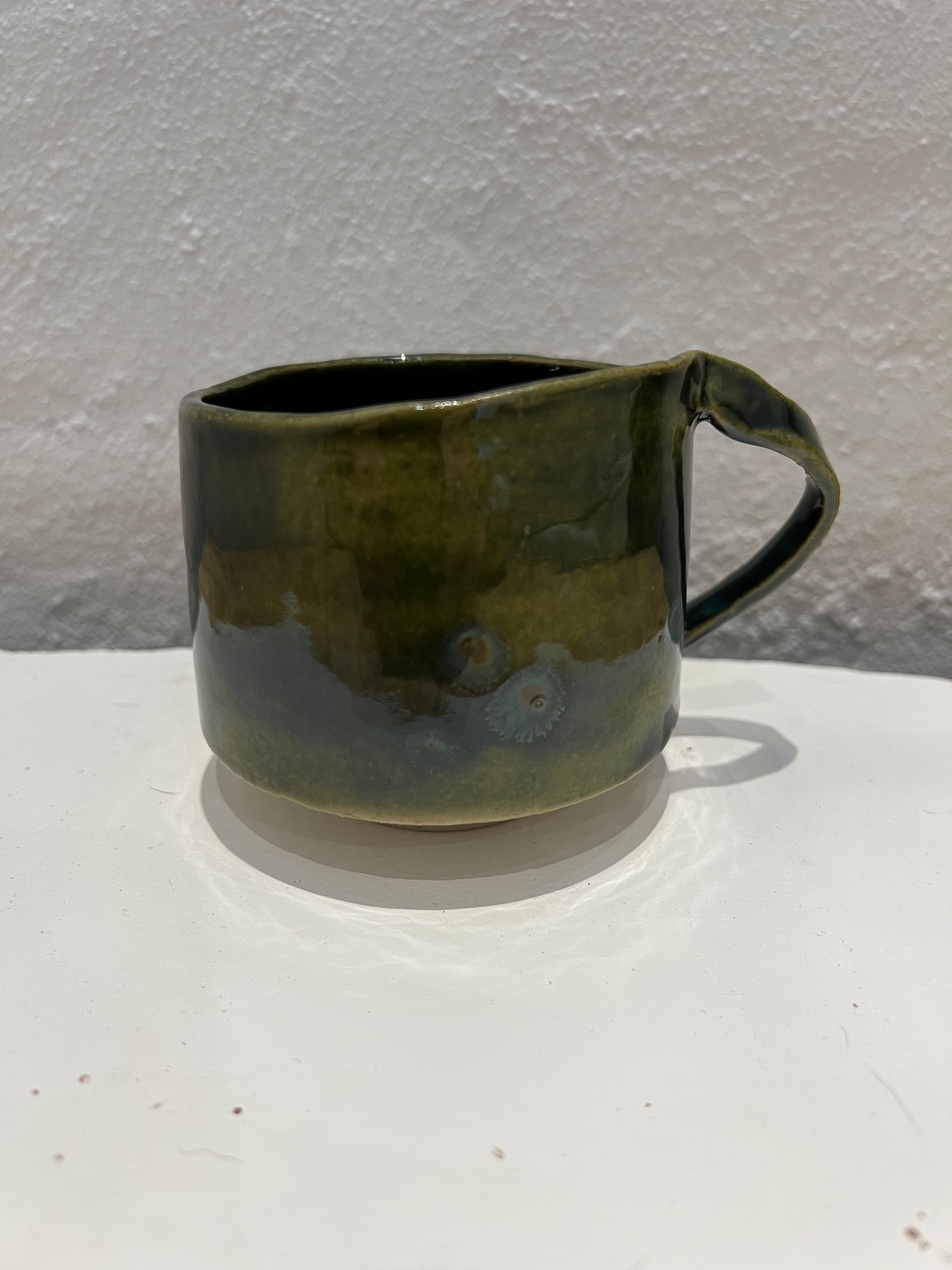 Håndlavet kop i stentøj med blank glasur i smukke grønne nuancer. Perfekt til både kaffe og te.