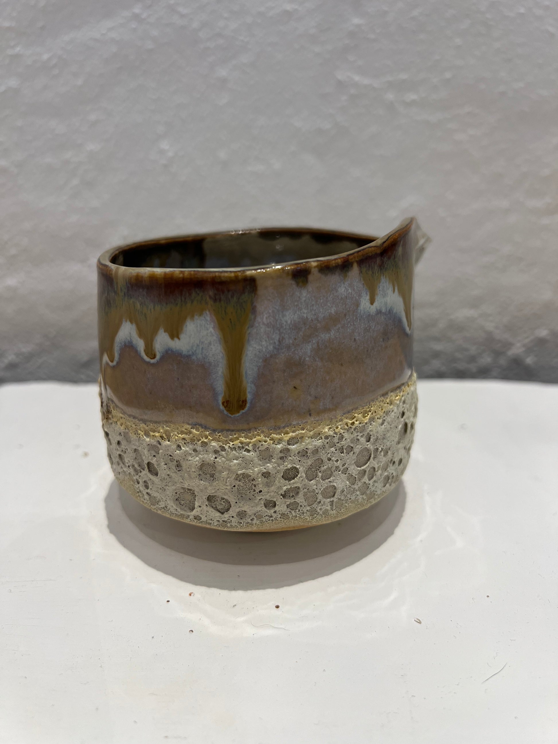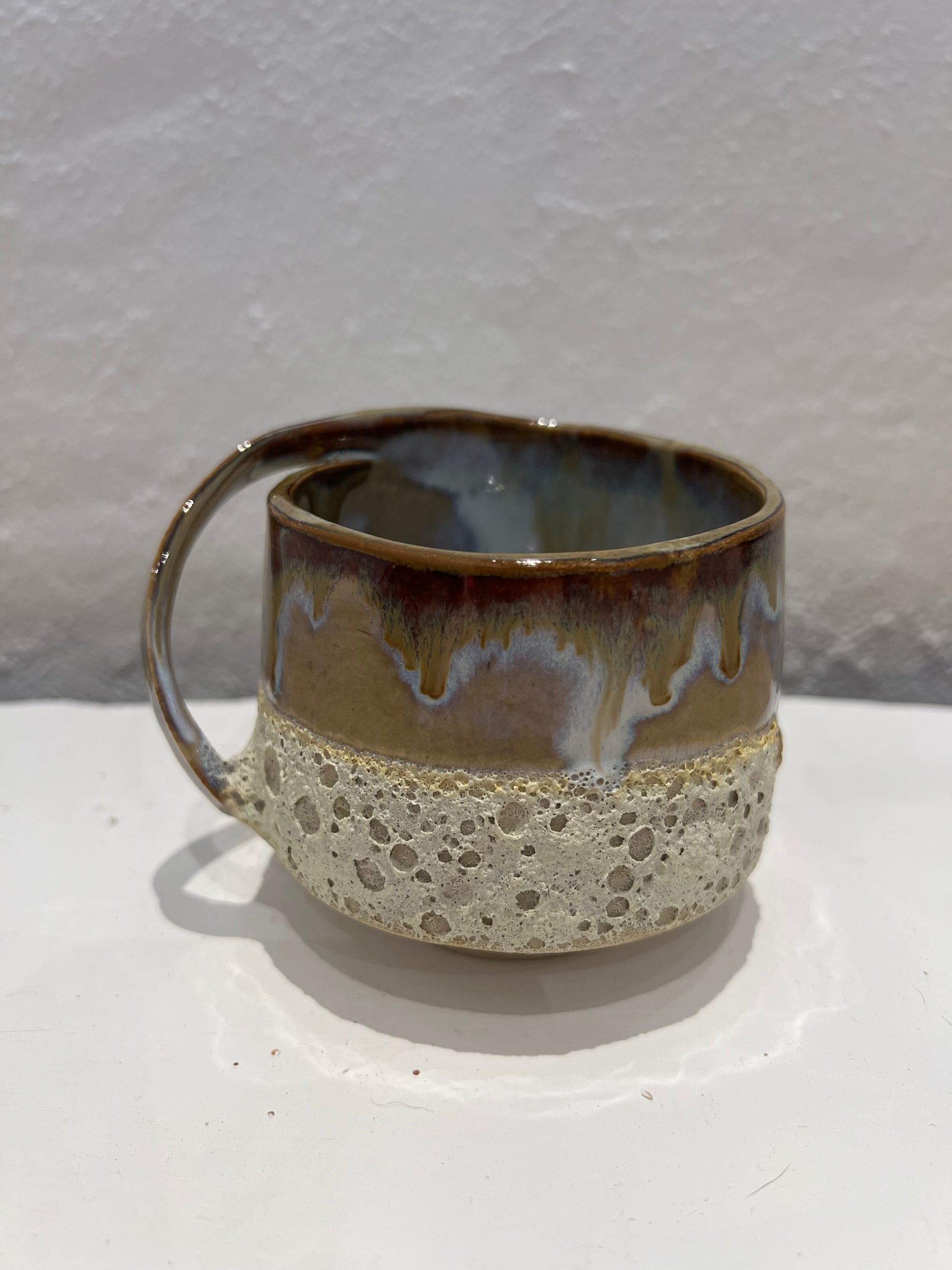 Håndlavet kop i stentøj med glasur i lyse jordtoner og gyldne detaljer, kombineret med en rå, sandfarvet bund. Velegnet til både kaffe og te.