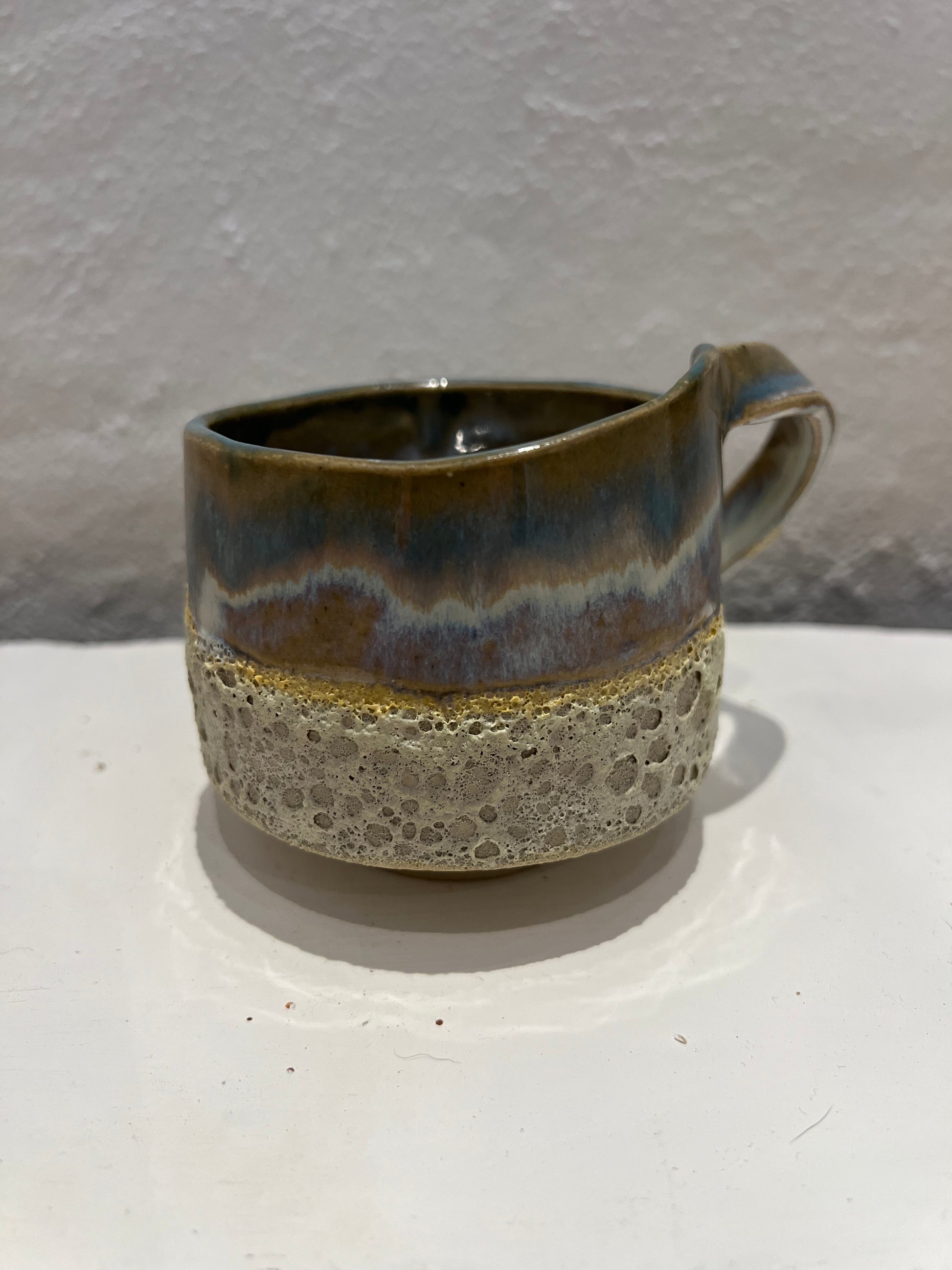 Håndlavet kop i stentøj med glasur i blå og brune nuancer samt rå, sandfarvet bund. Velegnet til både kaffe og te.