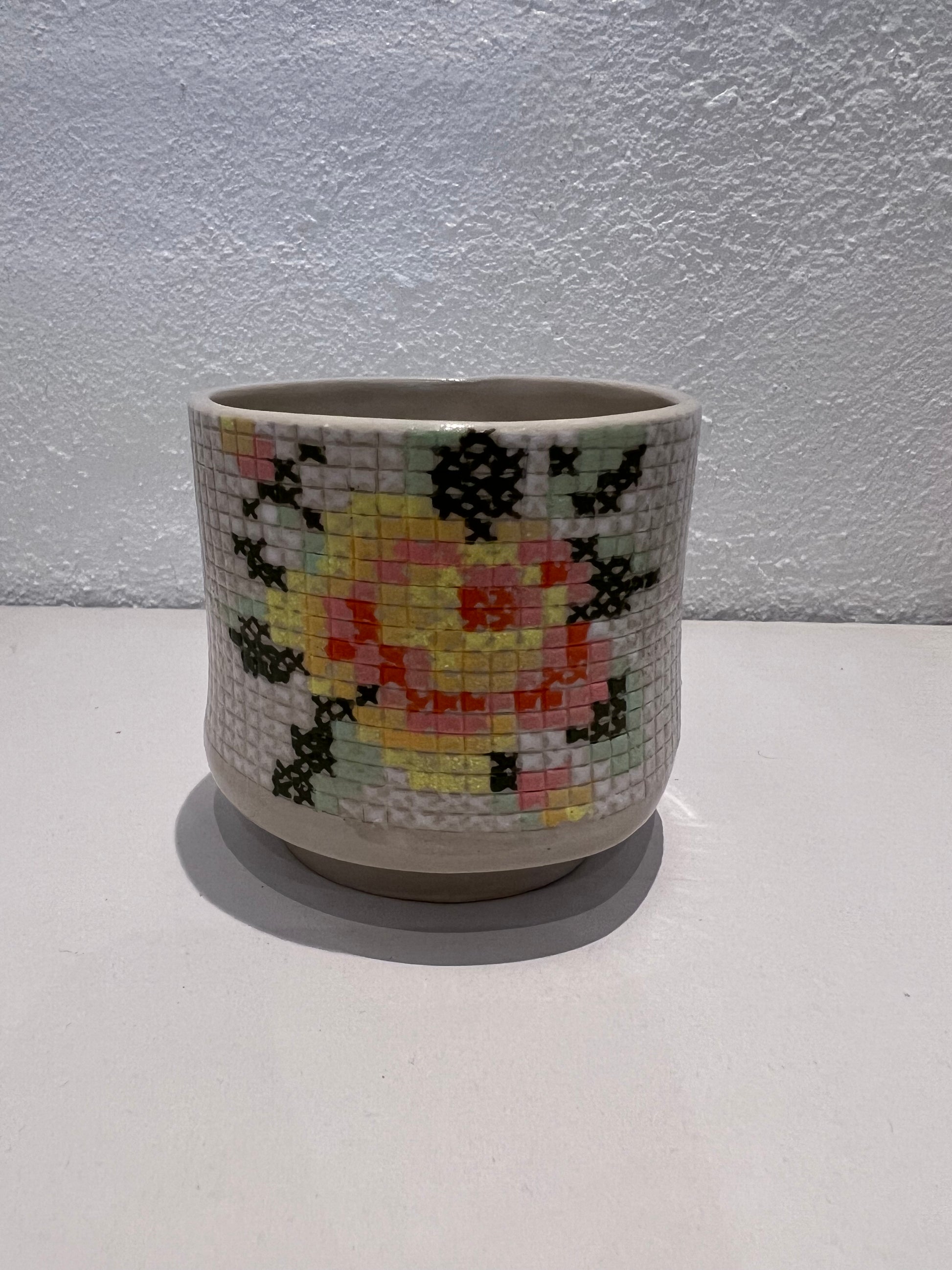 Håndlavet stentøjskop dekoreret med korssting, som man kender det fra broderi på en pude. Hvert kryds er håndmalet, hvilket giver et levende og detaljeret udtryk. Velegnet til både kaffe og te.