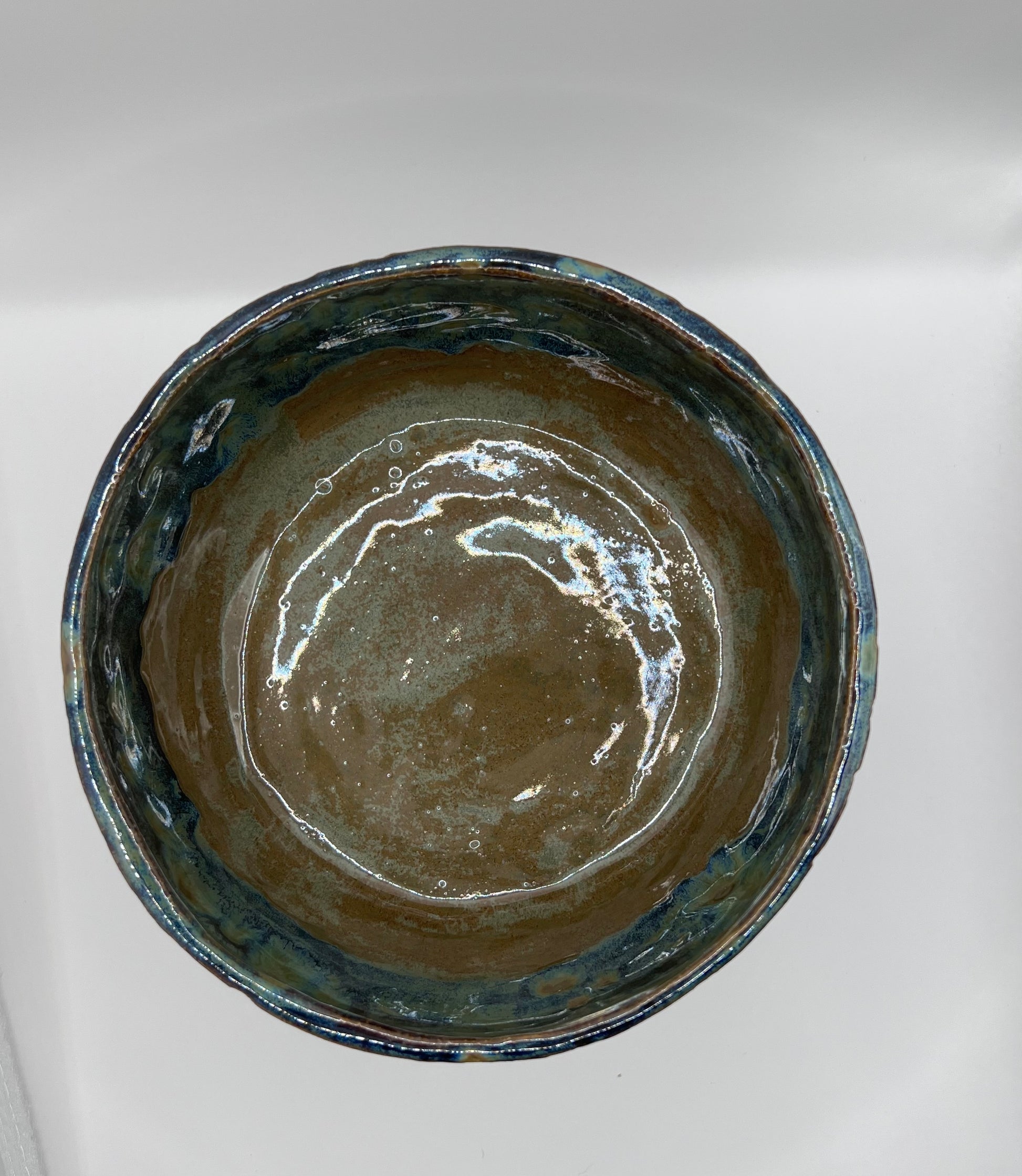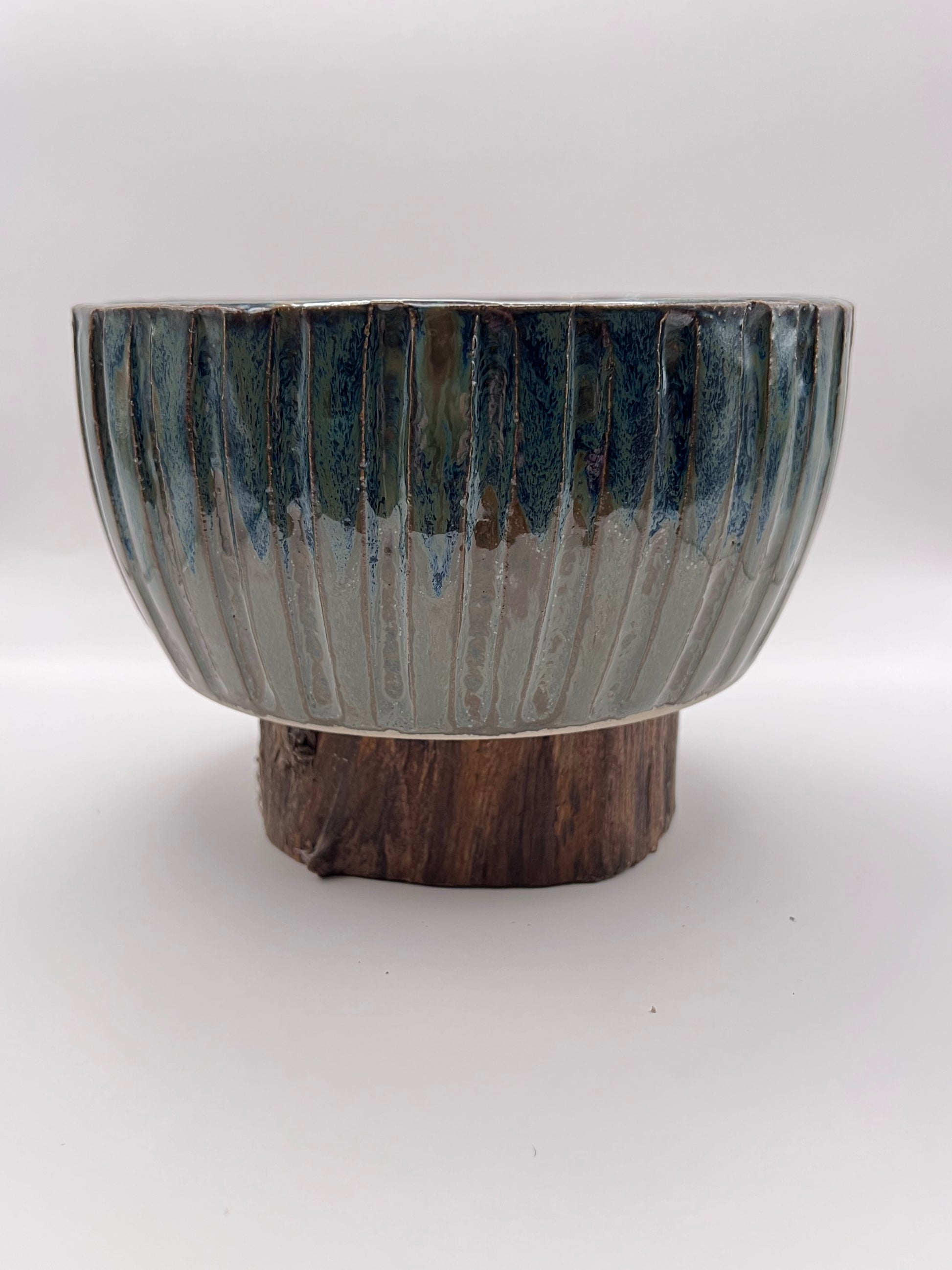 Skål i stentøj med flerfarvet glasur i grønne og blå nuancer samt dekorativ rillet overflade.