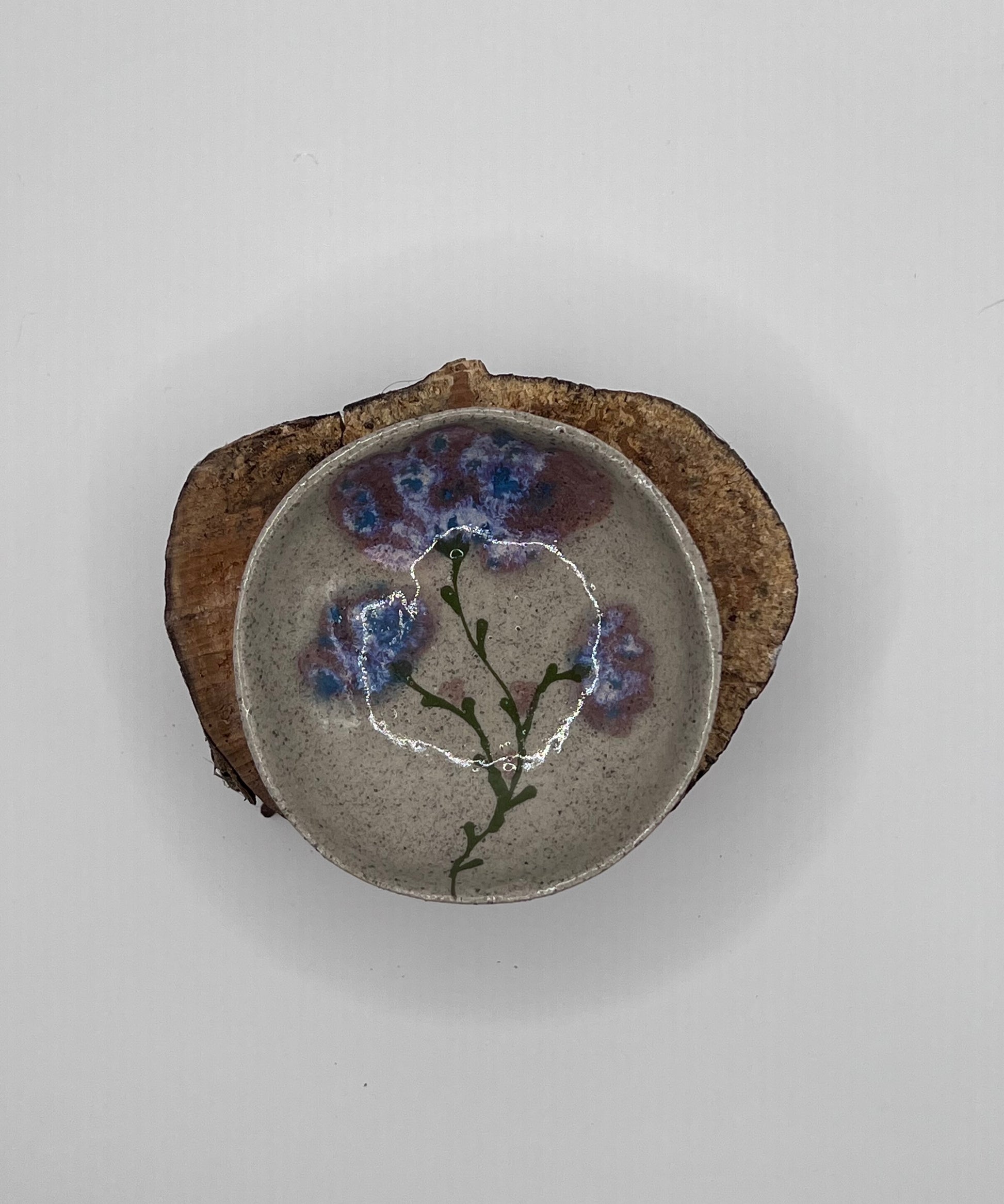 Lille sojaskål i stentøjsler med håndmalet blomstermotiv i varierende farvenuancer.
