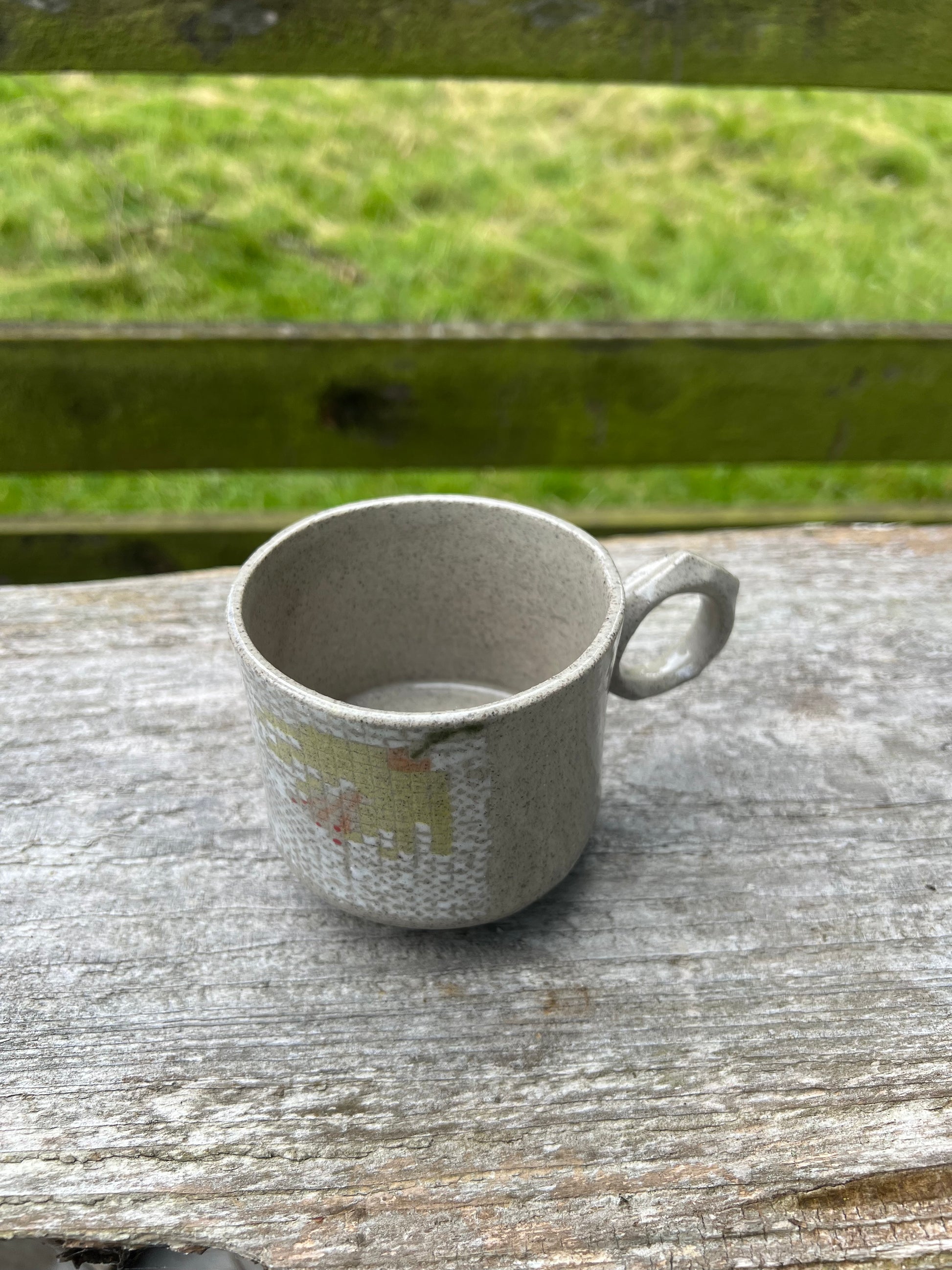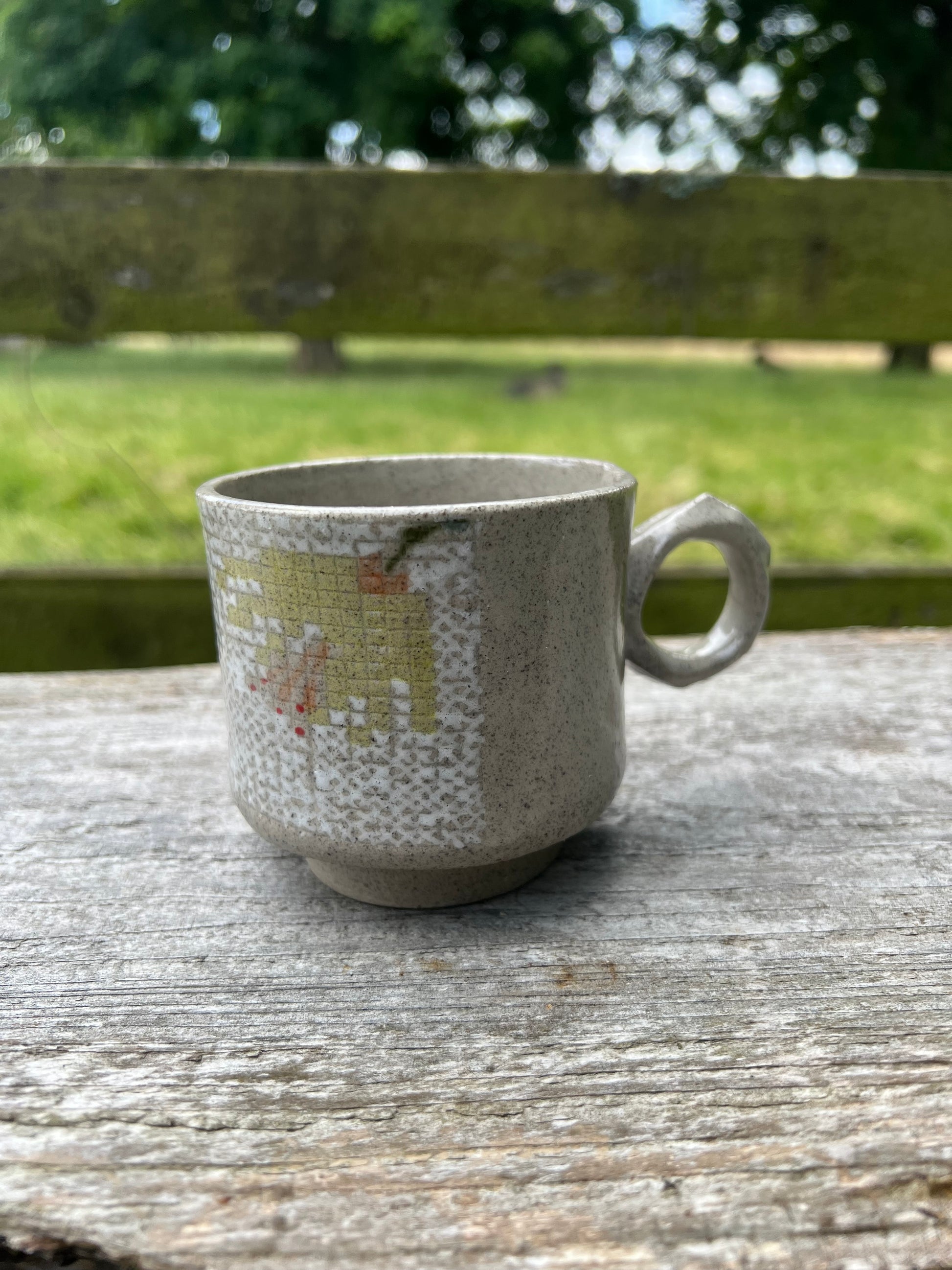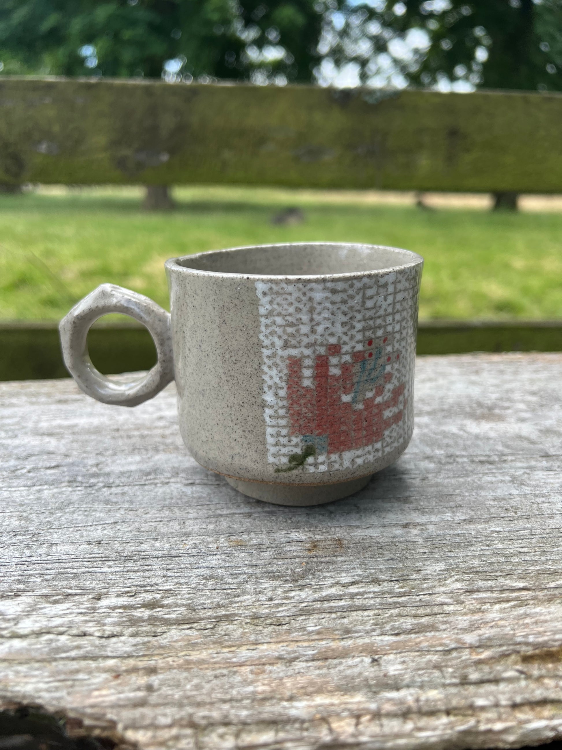 Håndlavet kop i stentøj med korsstingsmønster. Højde 8 cm, diameter 7,5 cm og rummer 2 dl. Kan stables – ideel til en god kop kaffe.