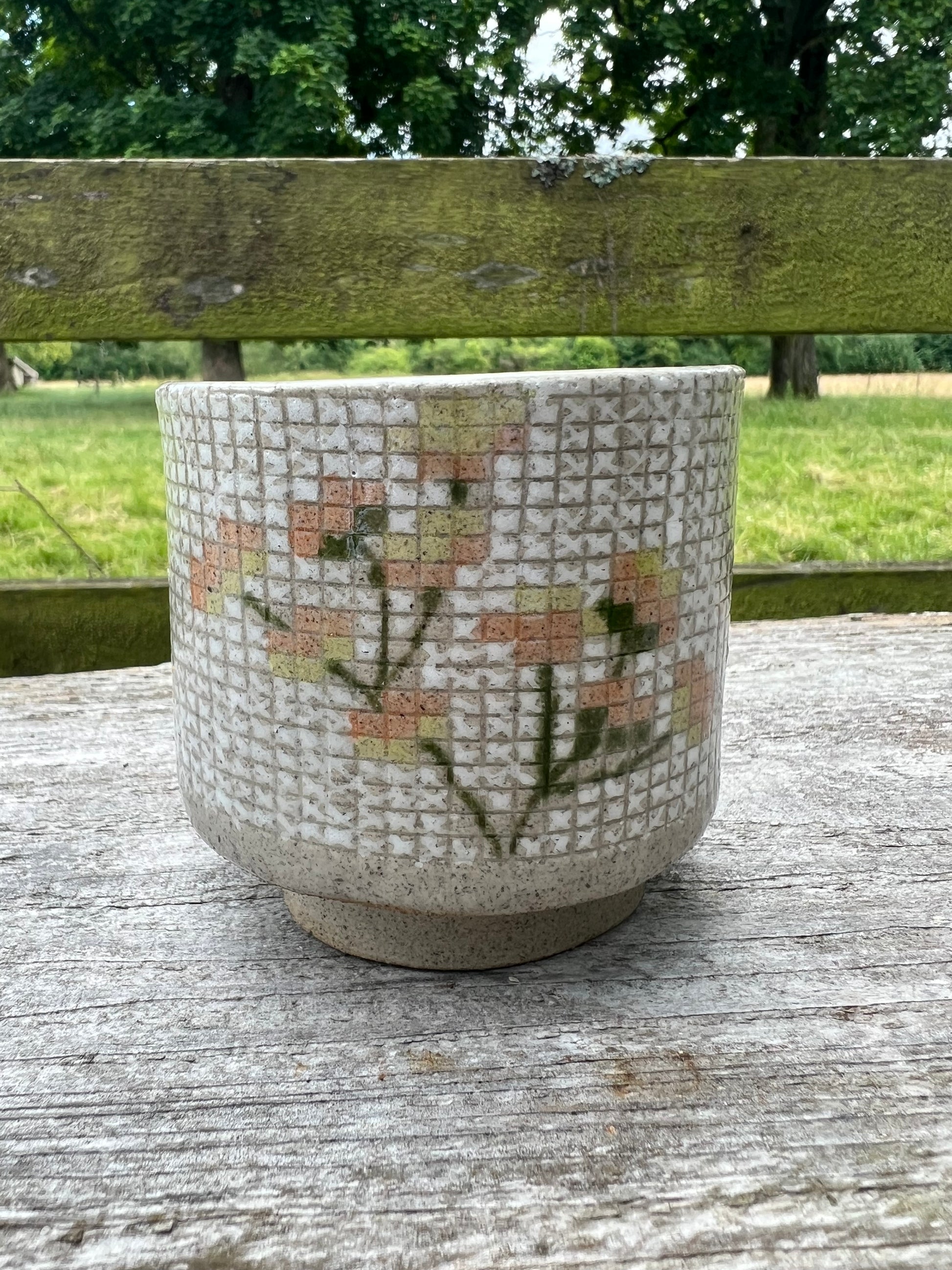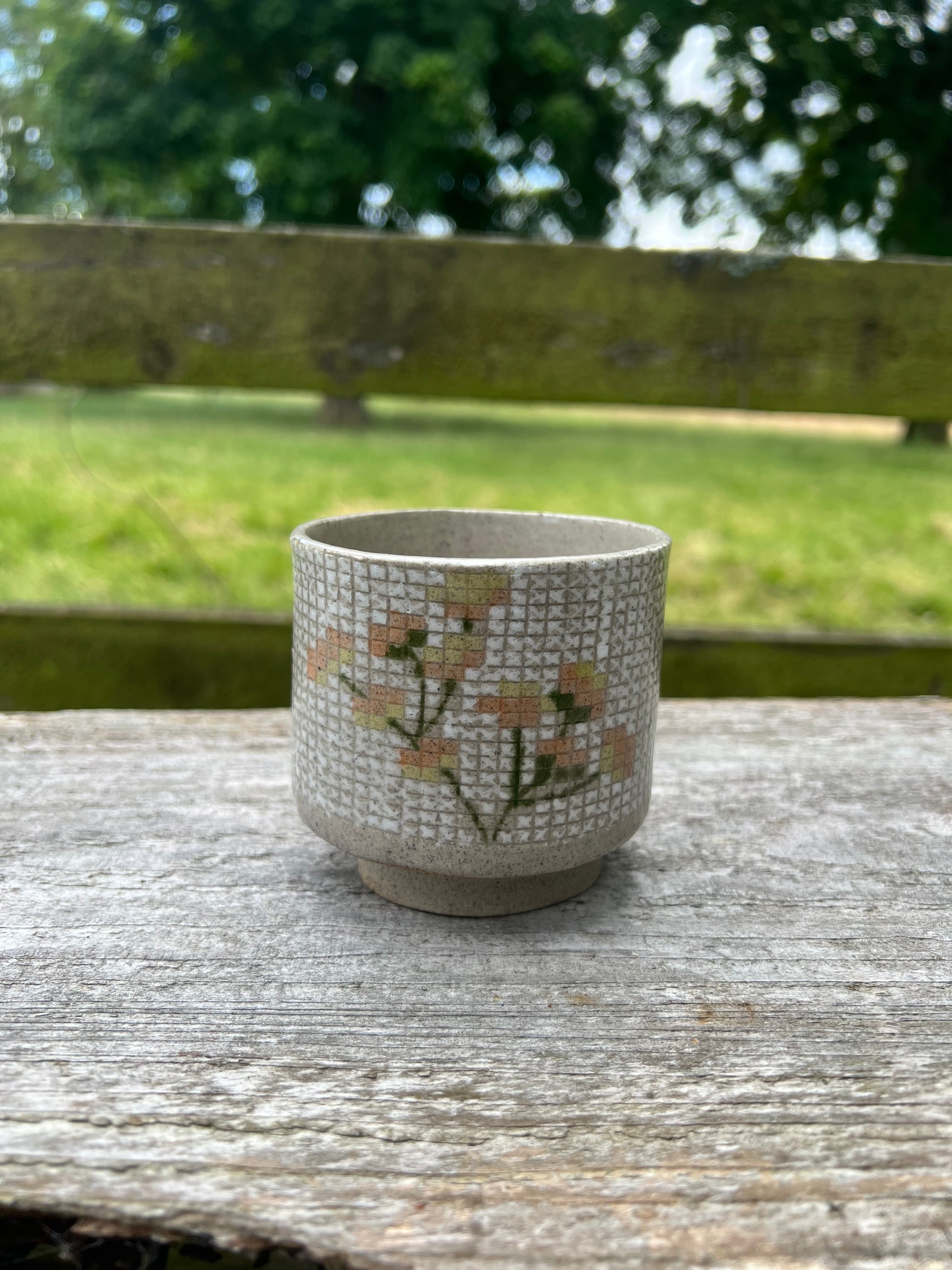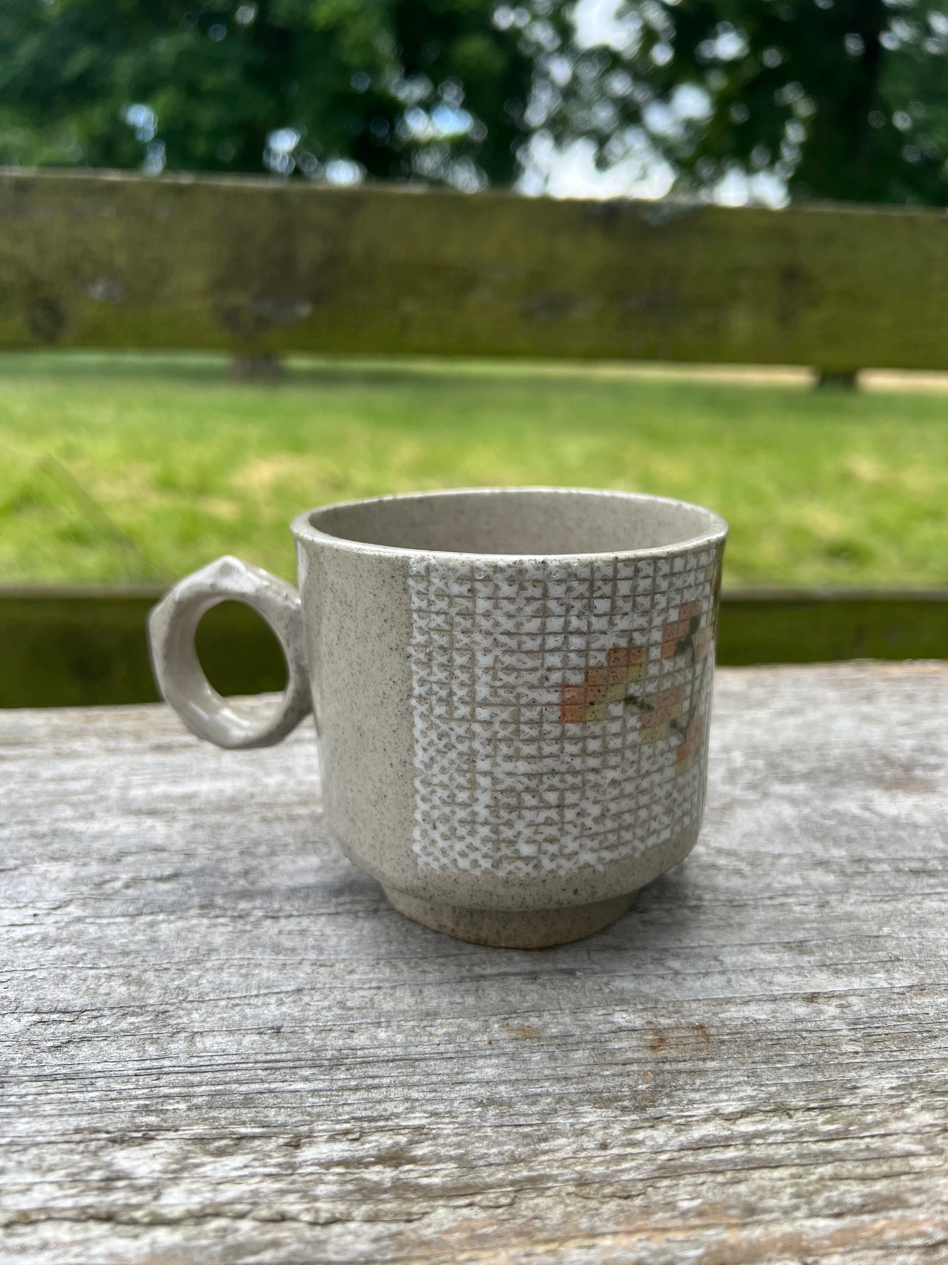 Håndlavet kop i stentøj med korsstingsmønster. Højde 8 cm, diameter 7,5 cm og rummer 2 dl. Kan stables – ideel til en god kop kaffe.