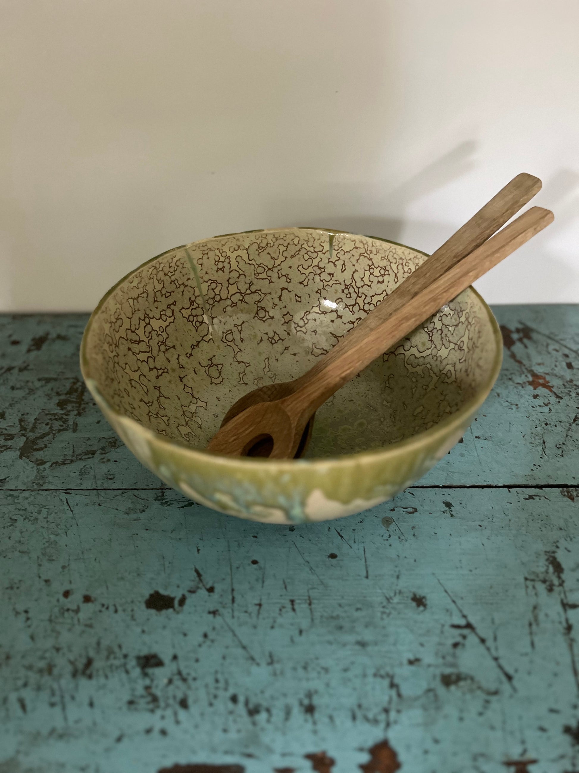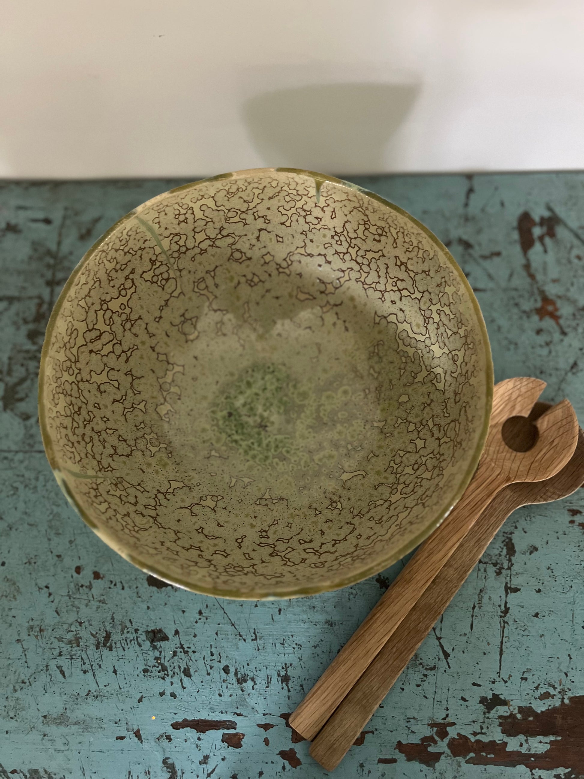 Håndlavet salatskål i stentøj med en højde på 15 cm og en diameter på 28 cm. Den har en smuk, organisk glasur og passer perfekt til både hverdag og festlige serveringer. Træredskaber medfølger ikke.