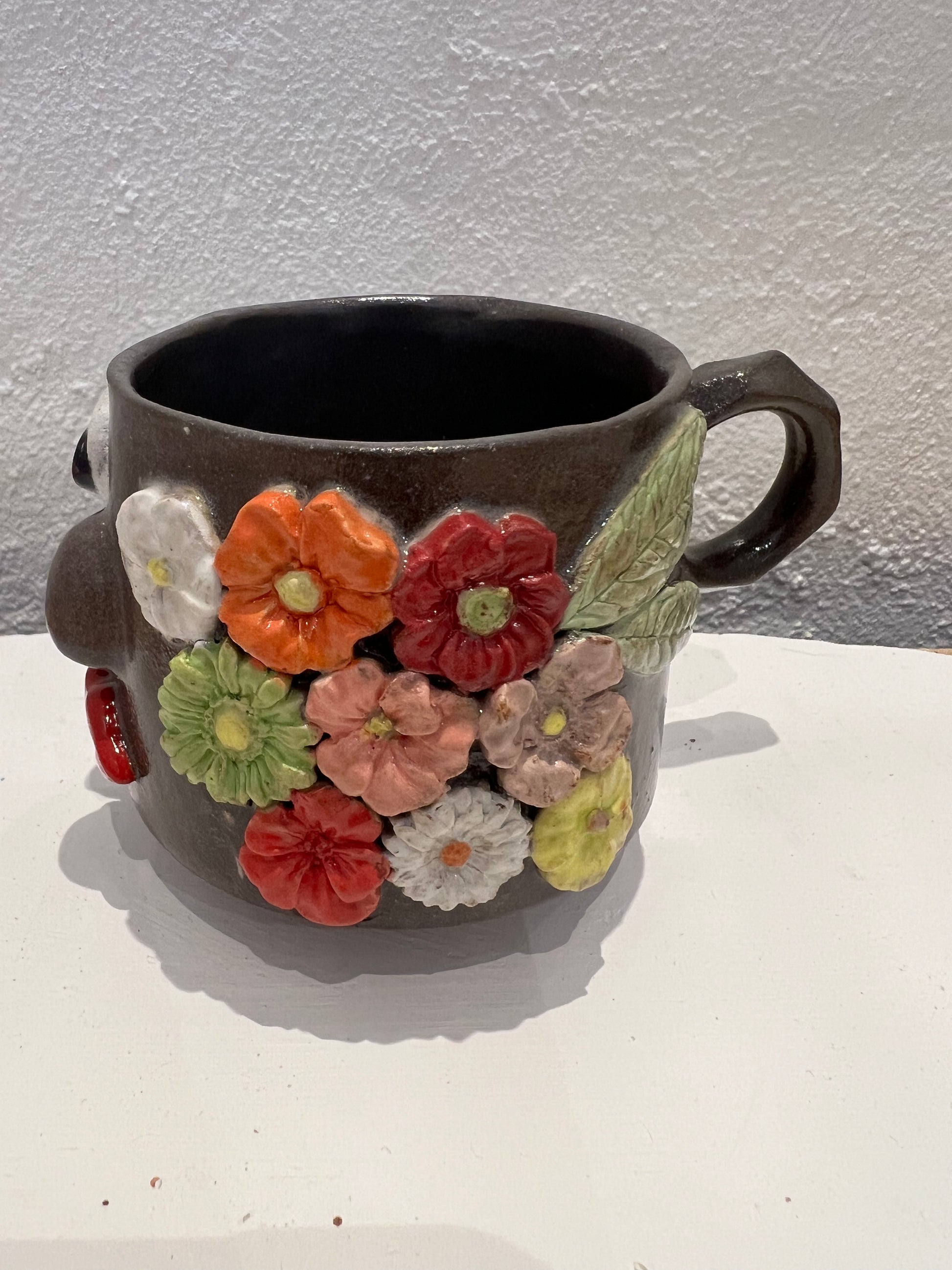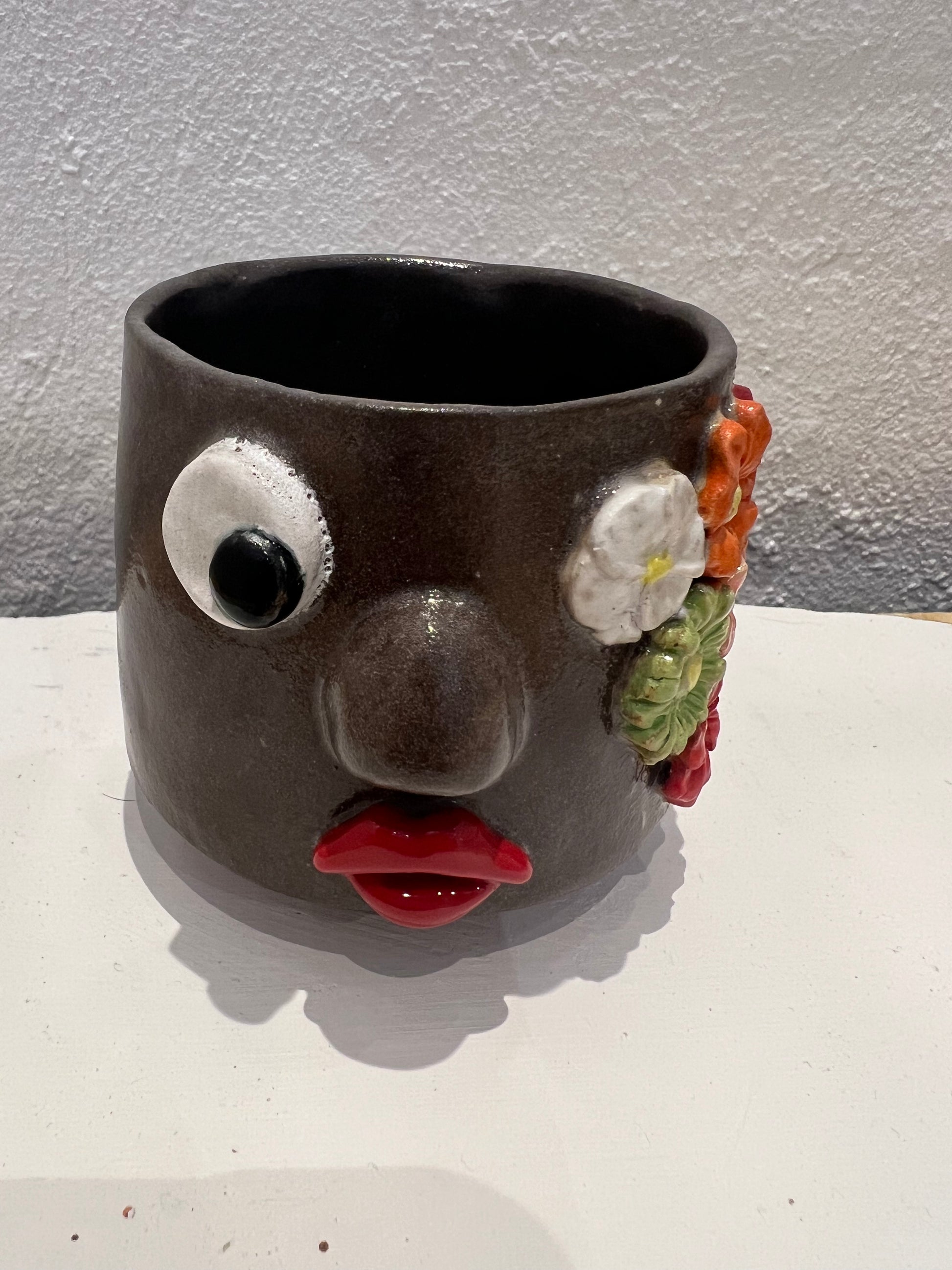Håndlavet kop i mørkt stentøj med sjovt ansigt foran og en buket farverige blomster på siden. Velegnet til både kaffe og te