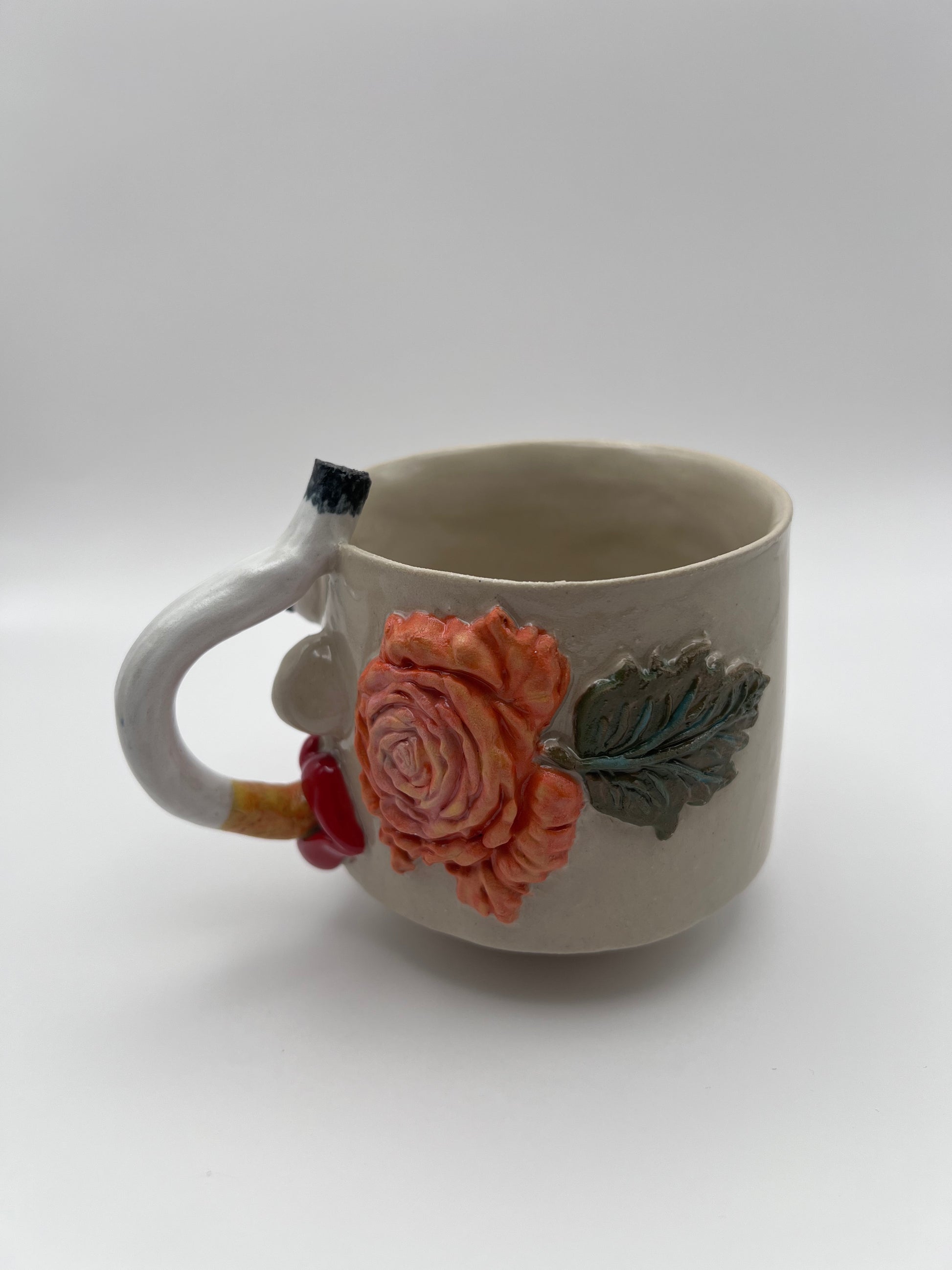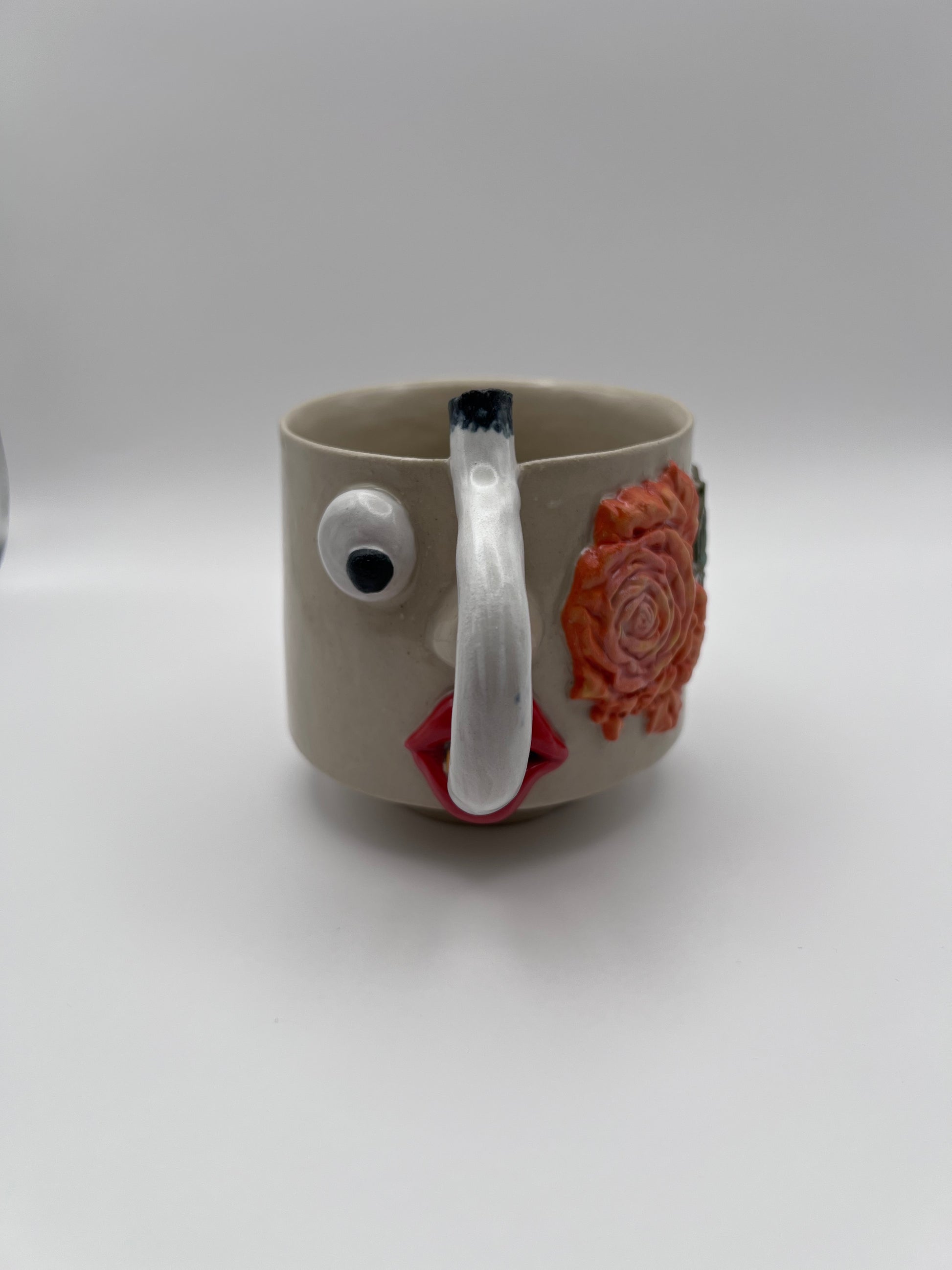 Håndlavet stentøjskop “Vera” med modelleret ansigt, cigaretformet hank og blomsterdetaljer. En karakterfuld kop til kaffe eller te.